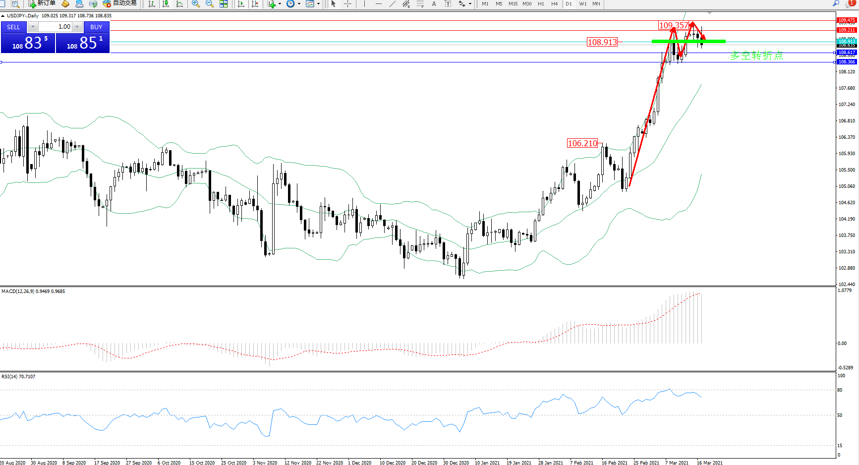 技术点评:多头动力延续布林带指标上轨附近持续震荡上扬,高位抵达109.357附近节点后遇阻开始整理回撤,高位短期或将维持窄幅整理走势,布林带指标呈收口走势持续中,MACD指标处于多头区域高位整理平移中,RSI指标处于多头区域高位80均衡线下方弱势徘徊有下移迹象;