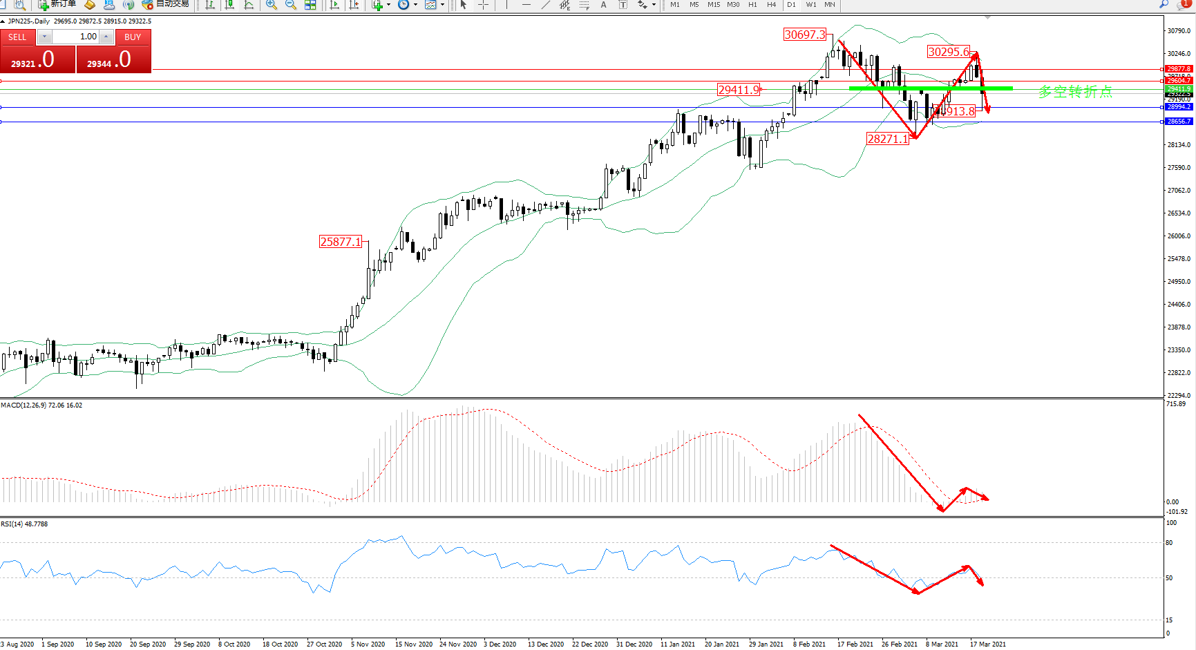 技术点评:高位空头动力震荡回撤后抵达28271位置得到支撑开始反转上移,触及布林带指标上轨附近节点30295附近后急速回撤,空头动力有进一步向下移动态势,布林带指标呈收口走势持续中,关注中轨附近节点,MACD指标高位空头动力急速震荡下行后纠结于0轴线附近持续震荡,RSI指标处于50均衡线上方维持整理后有下行迹象;