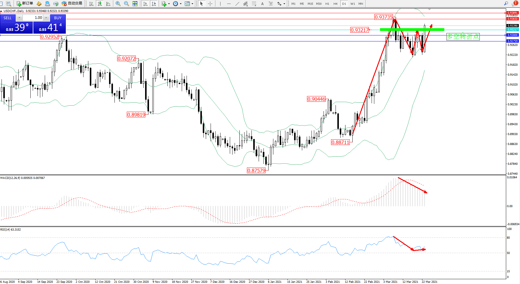美元兑瑞郎高位急速拉升至0.93390附近震荡,鉴于美国公债收益率和美元当前的水平,瑞郎可能已经超过了合理交易价值。从现在开始好像越来越难大幅上涨了,特别是如果美债收益率继续上扬的话,本周在尘埃落定之后,对美联储每个决策者的想法有更好的了解,很可能对美联储今后的方向会有更好的了解,将为瑞郎走向奠定基础。鲍威尔周一表示,美国经济“改善很大”,但同时也警告,复苏“远没有完成。”债券收益率已经接近顶部水平了,瑞郎走势还要看利率和债券收益率的表现,预计美国10年期国债收益率到今年四季度将涨至2%。市场焦点依然是还在负值但有可能上升的实际利率上。通胀的问题是必然会包括市场焦点依然是还在负值但有可能上升的实际利率上。通胀的问题是必然会包括瑞郎的,这是一大利好。但如果通胀的问题失去热度,那么黄金的下行支撑会很快消失的,这是一大利好。但如果通胀的问题失去热度,那么市场焦点依然是还在负值但有可能上升的实际利率上。