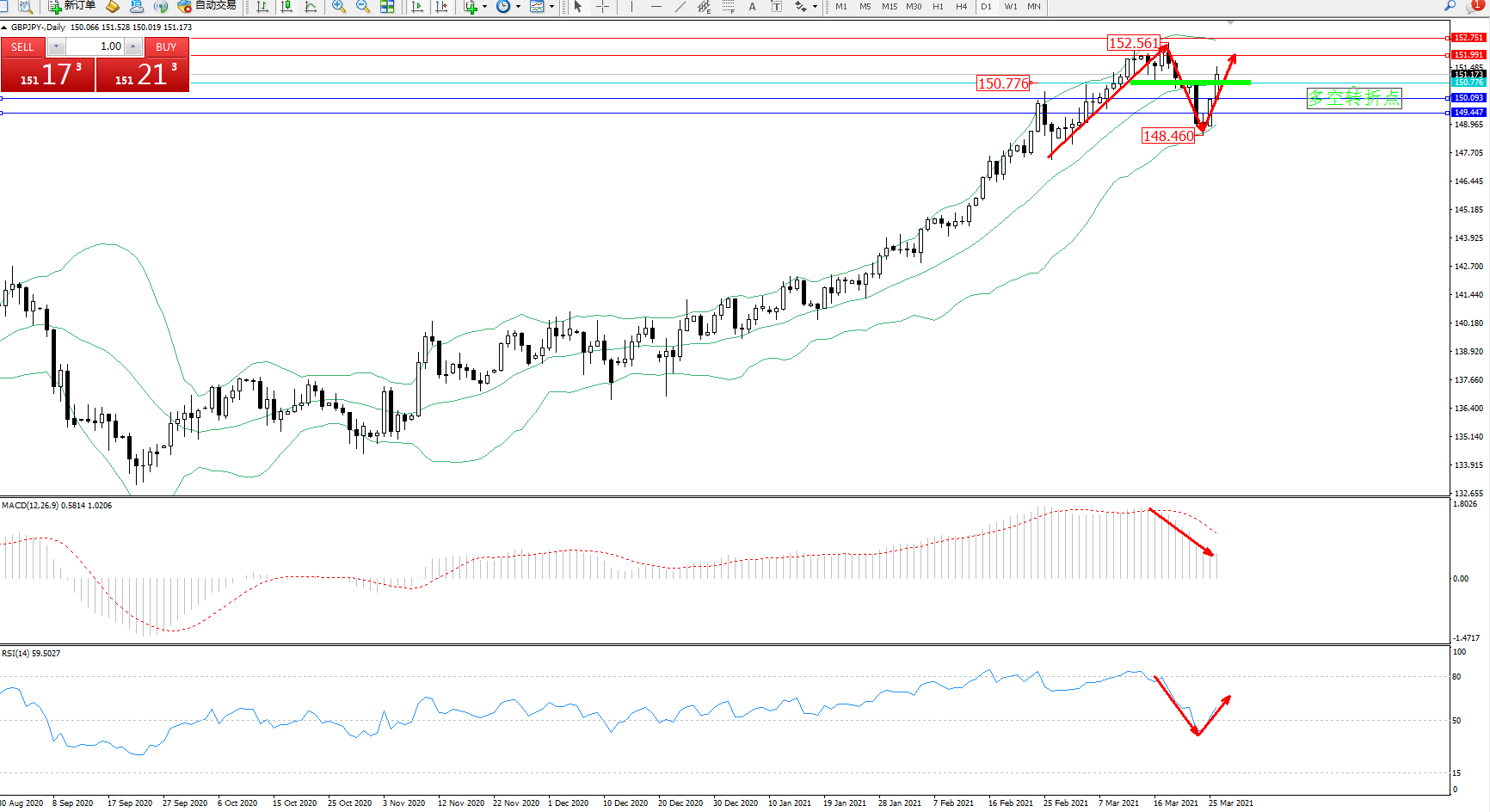 技术点评:多头动力延续布林带指标中上轨区间持续震荡上扬,高位抵达152.561位置节点附近遇阻回撤,触及下轨附近节点148.460附近后得到支撑开始反转上扬,多头动力强势反转突破中轨附近节点后有继续向上移动态势,布林带指标呈开始收口开始平移,关注中轨附近节点,MACD指标处于多头区域高位缓慢下移后开始平移,RSI指标空头动力持续震荡回撤至50均衡线下方震荡后急速反转上移;