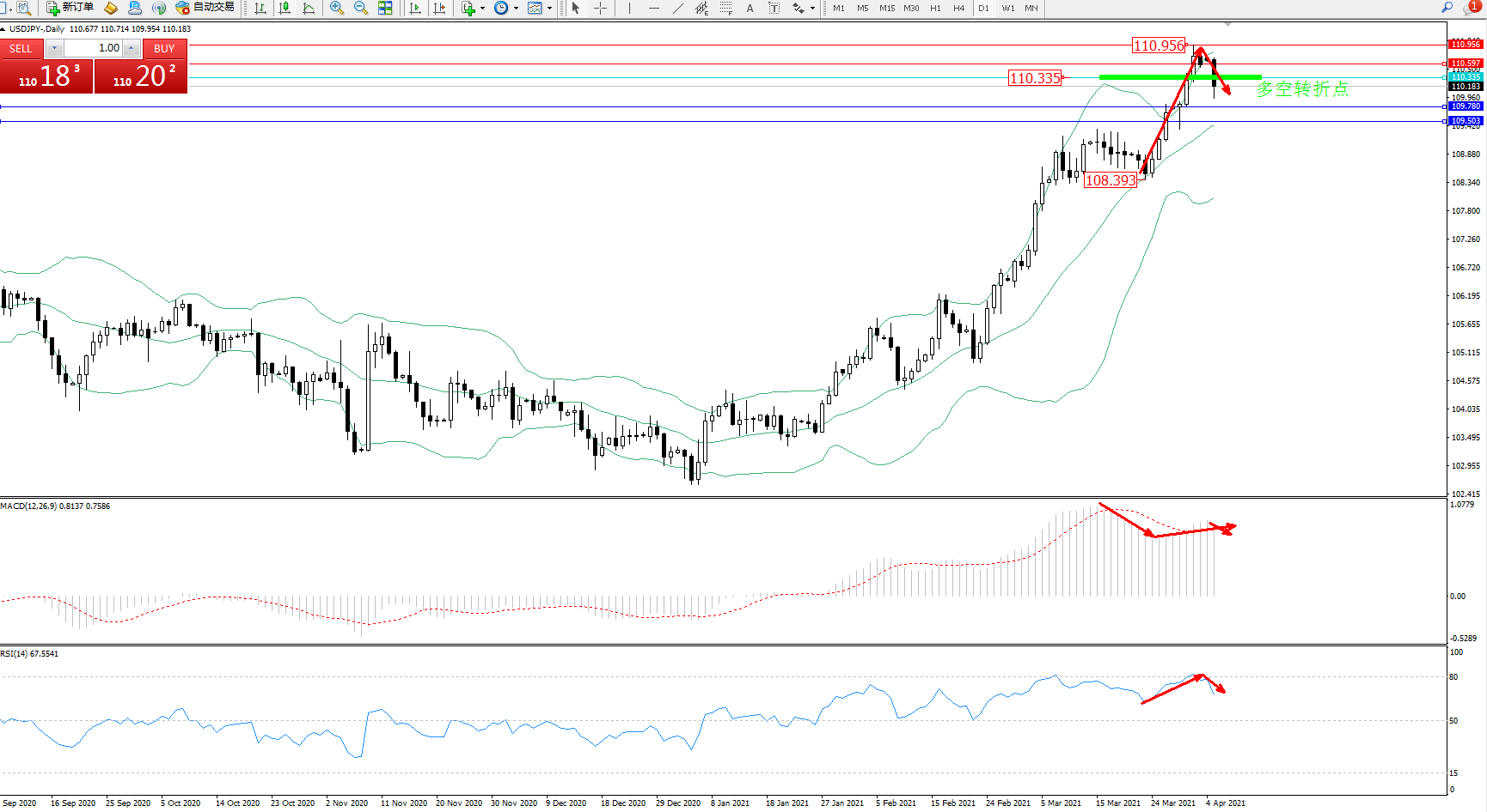 技术点评:多头动力延续布林带指标上轨附近持续震荡上扬,高位抵达110.956位置后遇阻回撤,空头动力短期反转下行走势持续,布林带指标呈张口走势后开始有收口迹象,MACD指标处于多头区域高位维持整理持续平移,RSI指标高位触及超买区80均衡线附近节点后遇阻反转下行中;