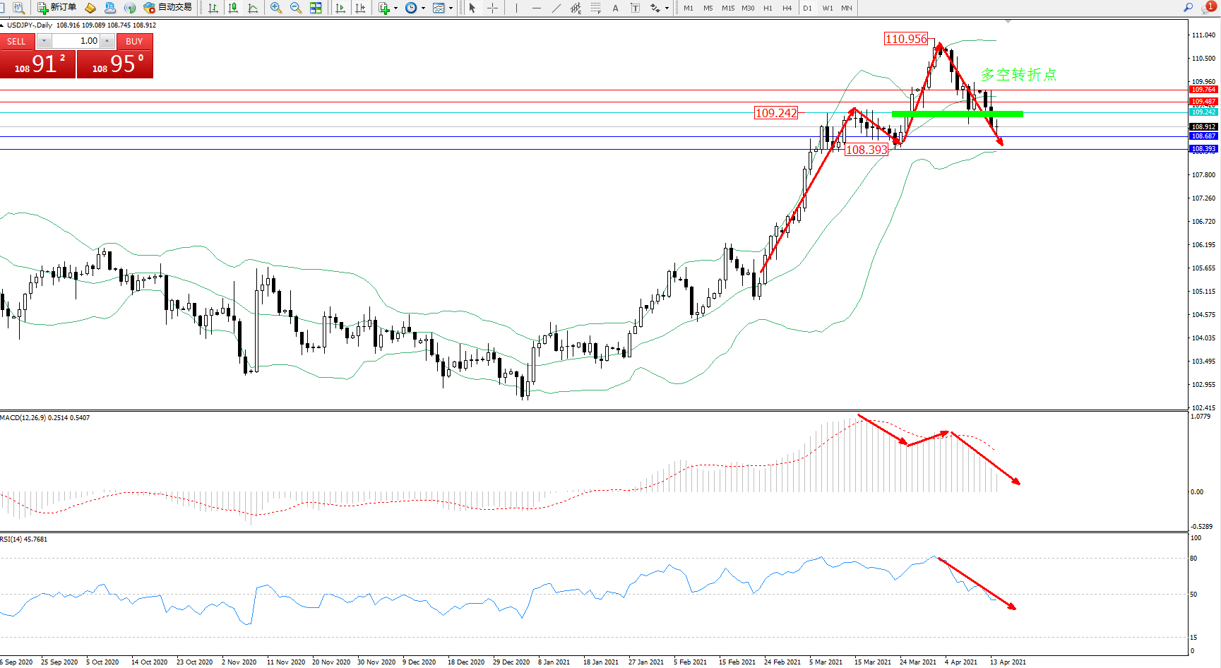 技术点评:多头动力延续布林带指标中上轨区间通道持续震荡上扬,高位抵达110.956位置遇阻回撤,跌破布林带指标中轨附近节点后维持宽幅震荡,空头动力依旧有继续下行迹象,布林带指标呈张口走势后开始缓慢收口,关注中轨附近节点,MACD指标处于多头区域高位震荡回撤,RSI指标高位持续回撤下行跌破0轴线进入空头区域继续下移;