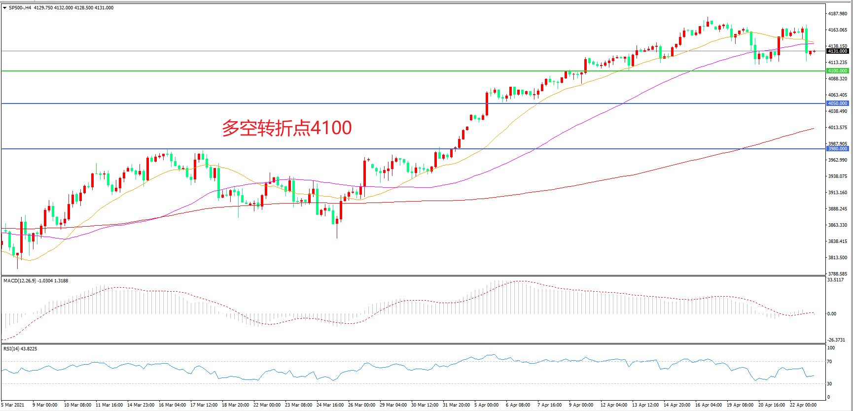 周四(4月22日),全球新冠疫情担忧加剧,日本首相建议东京进入紧急状态,印度疫情全面失控,市场风险情绪回落。在拜登计划大幅上调富人资本利得税的消息传出后,标普500大幅下挫,收报4129.25点。大盘跳水之时,龙头科技股盘中齐跌。到收盘时,特斯拉跌超3%跌幅居前,Facebook、苹果、微软、亚马逊均跌逾1%。