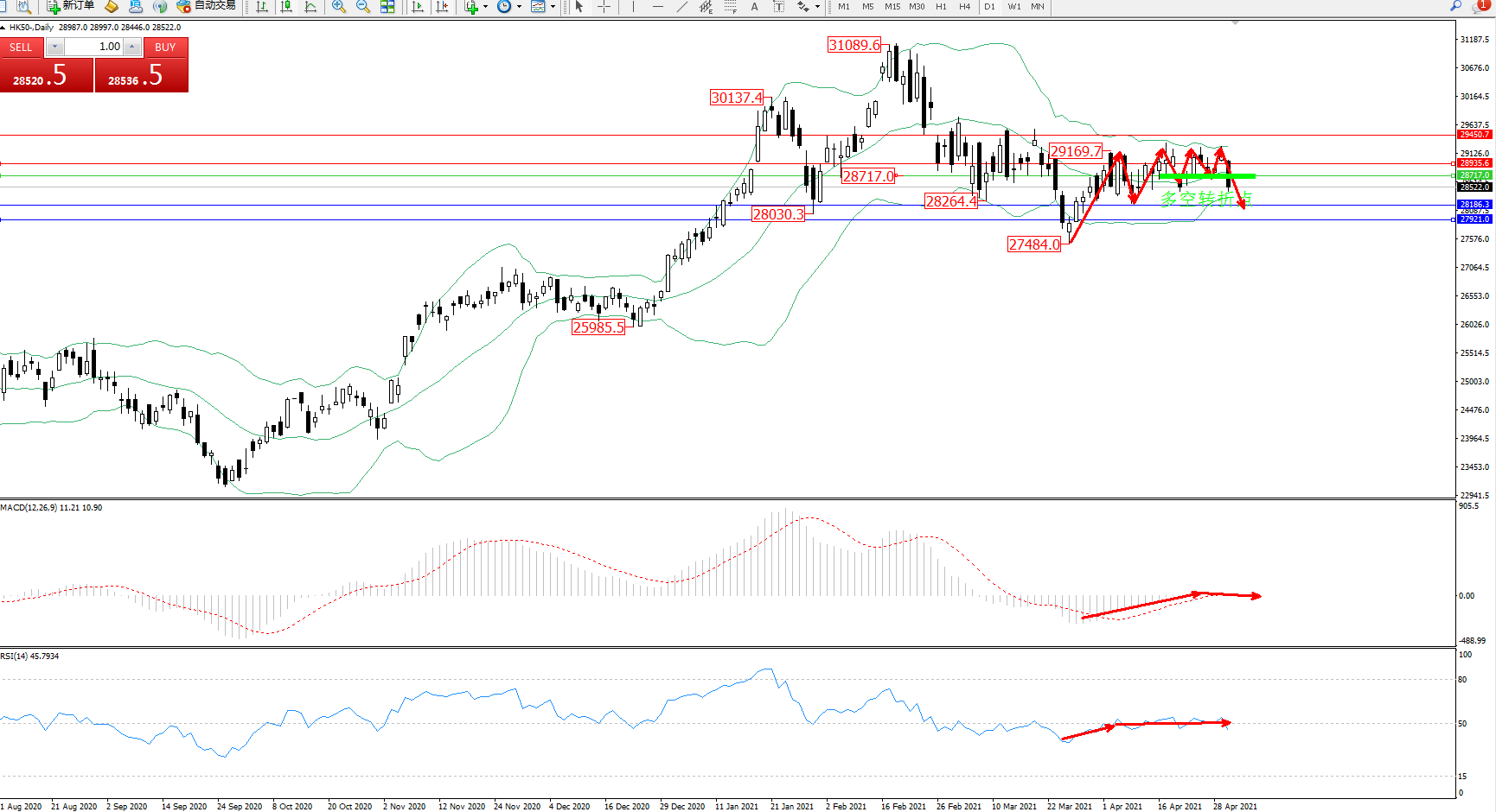 香港恒生指数4月30日(周五)收盘下跌578.38点,跌幅1.97%,报28724.88点;港股主要指数全天呈单边下跌行情,三大指数均大幅收跌。恒生科技指数跌2.2%报8313点。型科技股重挫,美团、快手跌超3%,阿里巴巴、京东、小米、网易跌超2%;医美概念股持续走强,在弱势行情中表现亮眼,药品股、重型机械股等少数板块上涨。港股4月收官,恒生科技指数涨1.58%。香港一名菲佣29日傍晚确诊感染新冠肺炎。据悉,该菲佣近期并未离港外出,但体内有N501Y及E484K两种变种病毒株,属于在南非发现的变种病毒,菲佣雇主的10个月大女婴也确诊。该病例被列为香港本地无源头个案,是香港首例社区感染变种病毒。香港食物及卫生局副局长徐德义表示,政府很关注变种病毒流入社区的情况,今日(30日)下午将会召开记者会,详细公布应对方案。香港本地餐饮股应声下挫,誉宴集团大跌超7%,徐福楼集团跌4.65%,翠华控股跌逾3%。