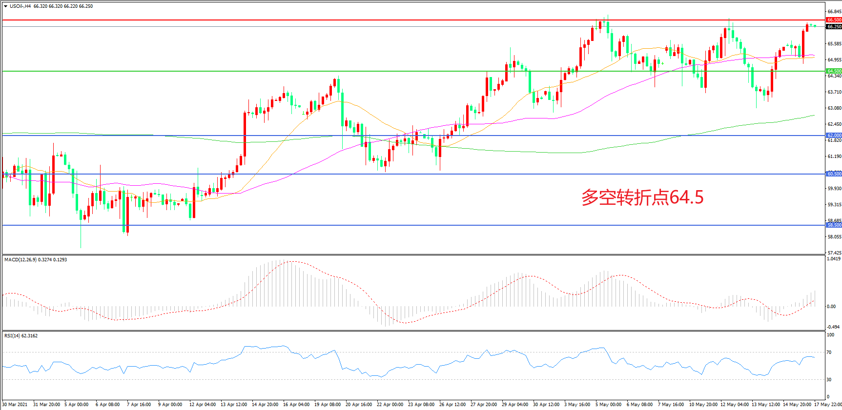 另外一个令人担忧的因素是印度的疫情继续发酵。最近有印度媒体爆出来消息称,随着疫情的失控,印度死亡人数快速增加。这已经超出了某些地区所能够应对的极限,同时,昨天公布的数据显示,五月份上半个月,印度成品油需求大幅下滑。现在美油再度回到66.5美元附近,能否一鼓作气突破前高现在还尚未可知。
