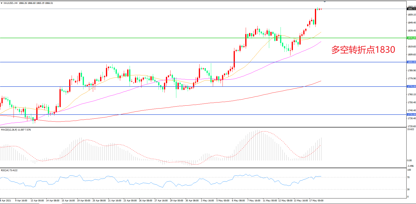 周一(5月17日),随着疫情期间全球央行大放水产生的负面影响渐渐显现,全球经济也开始动荡,美国通胀的担忧加剧以及亚洲部分地区新冠病例增加推高了市场中的避险情绪,多头持续发力,现货黄金大幅拉升,收报1866.09美元/盎司。目前黄金价格虽然还没有达到去年夏末的水平,但已经收复了今年年初的大部分失地。