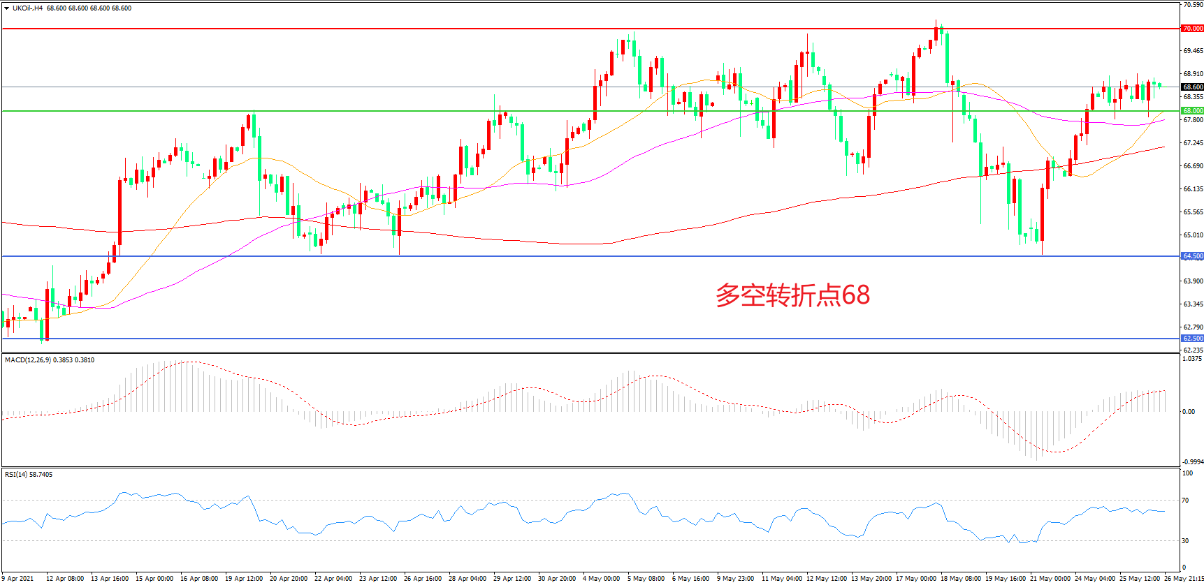 4小时图看,油价延续高位调整,区间震荡迹象较为明显,21周期均线成为下方支撑,70美元成为中期阻力,MACD红柱增加,RSI指标走瓶,日内延续震荡概率较大。