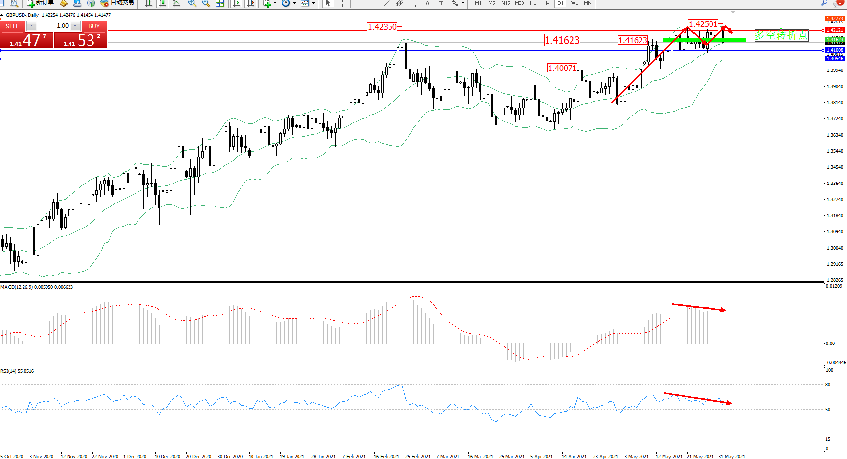 交易策略:1.41623下方看跌,目标1.41008、1.40546