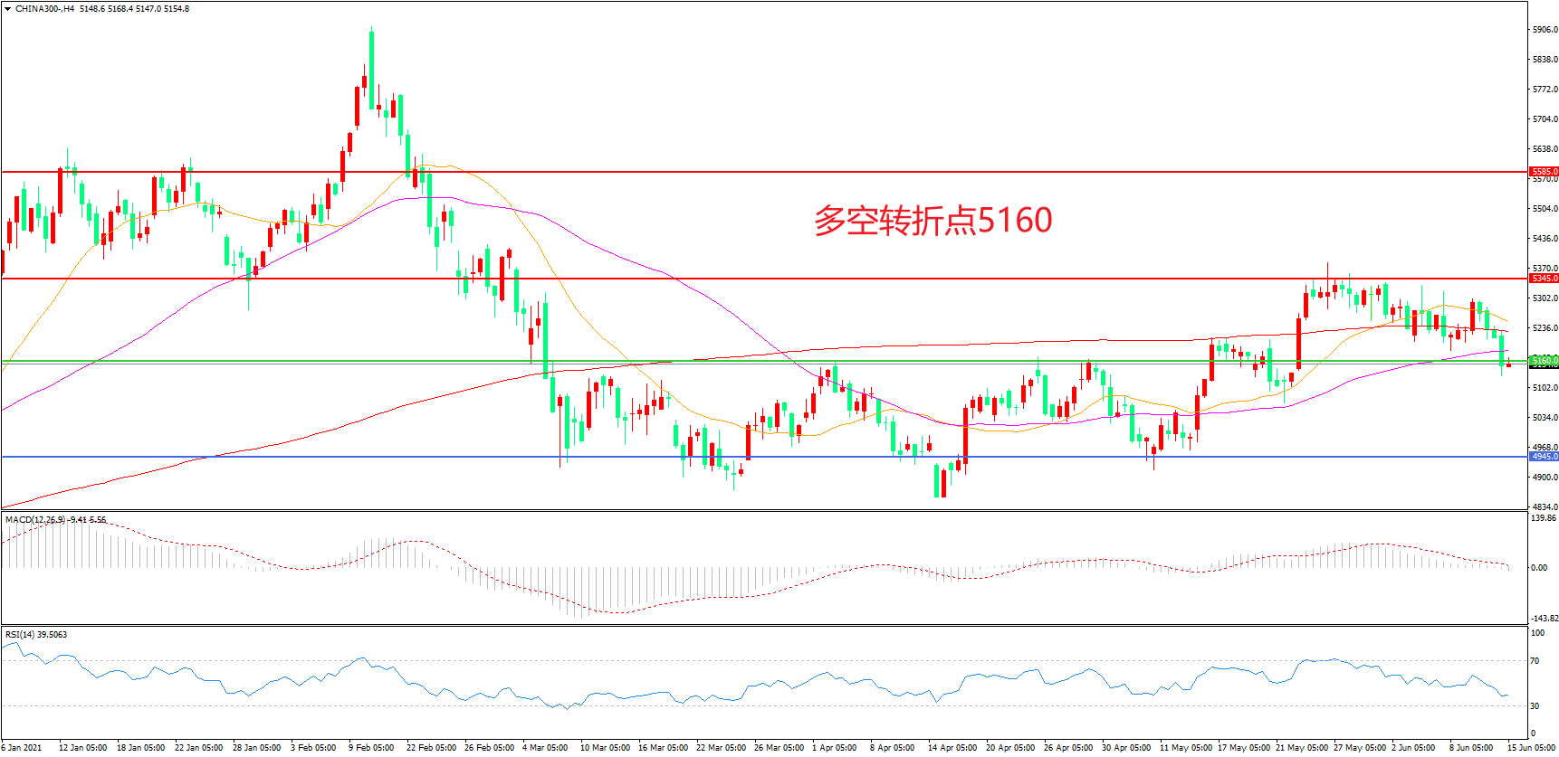 4小时图看,沪深300长阴下破,跌破前期整理区间,55周期均线被跌穿,MACD红柱缩短,RSI指标走平,日内震荡下行概率较大。