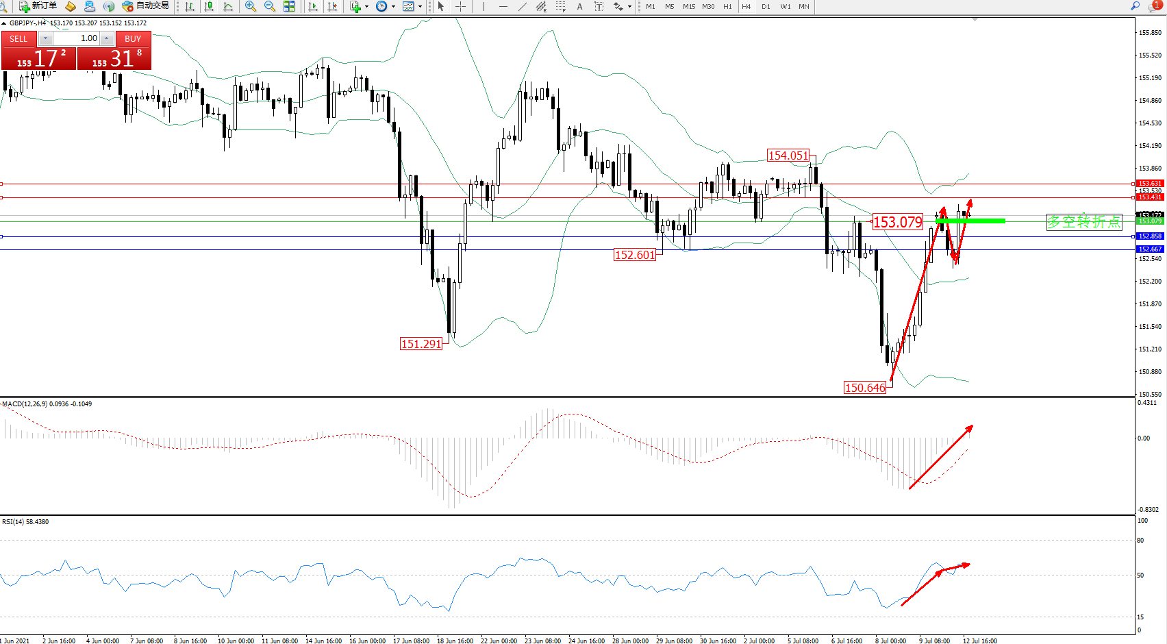 交易策略:153.079上方看涨,目标153.431、153.631