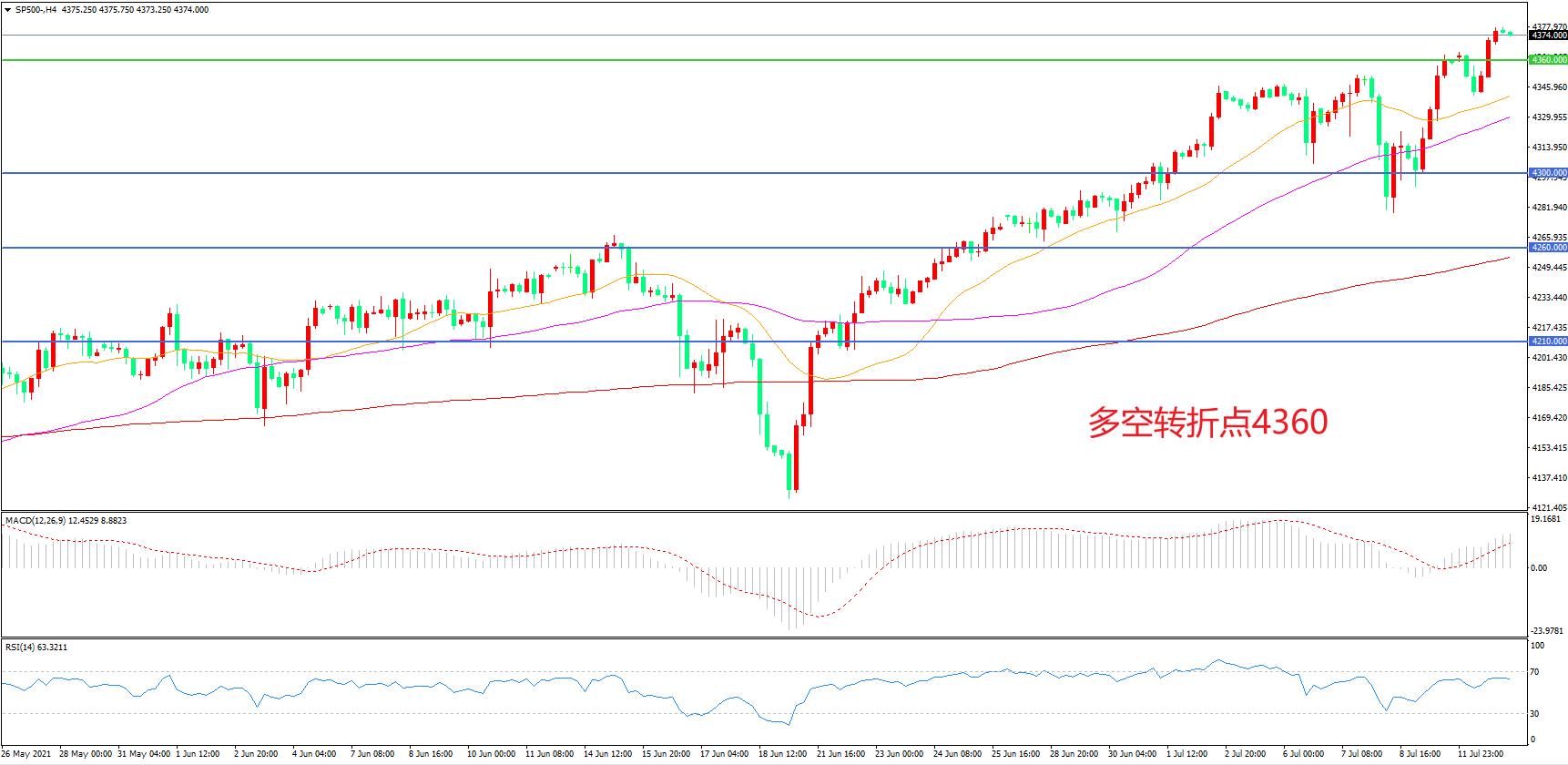 4小时图看,标普500阳线强势拉升,短线表现强势,4360成为多空分水岭,均线系统呈多头排列,MACD红柱增加,RSI指标走平,日内震荡上行概率较大。