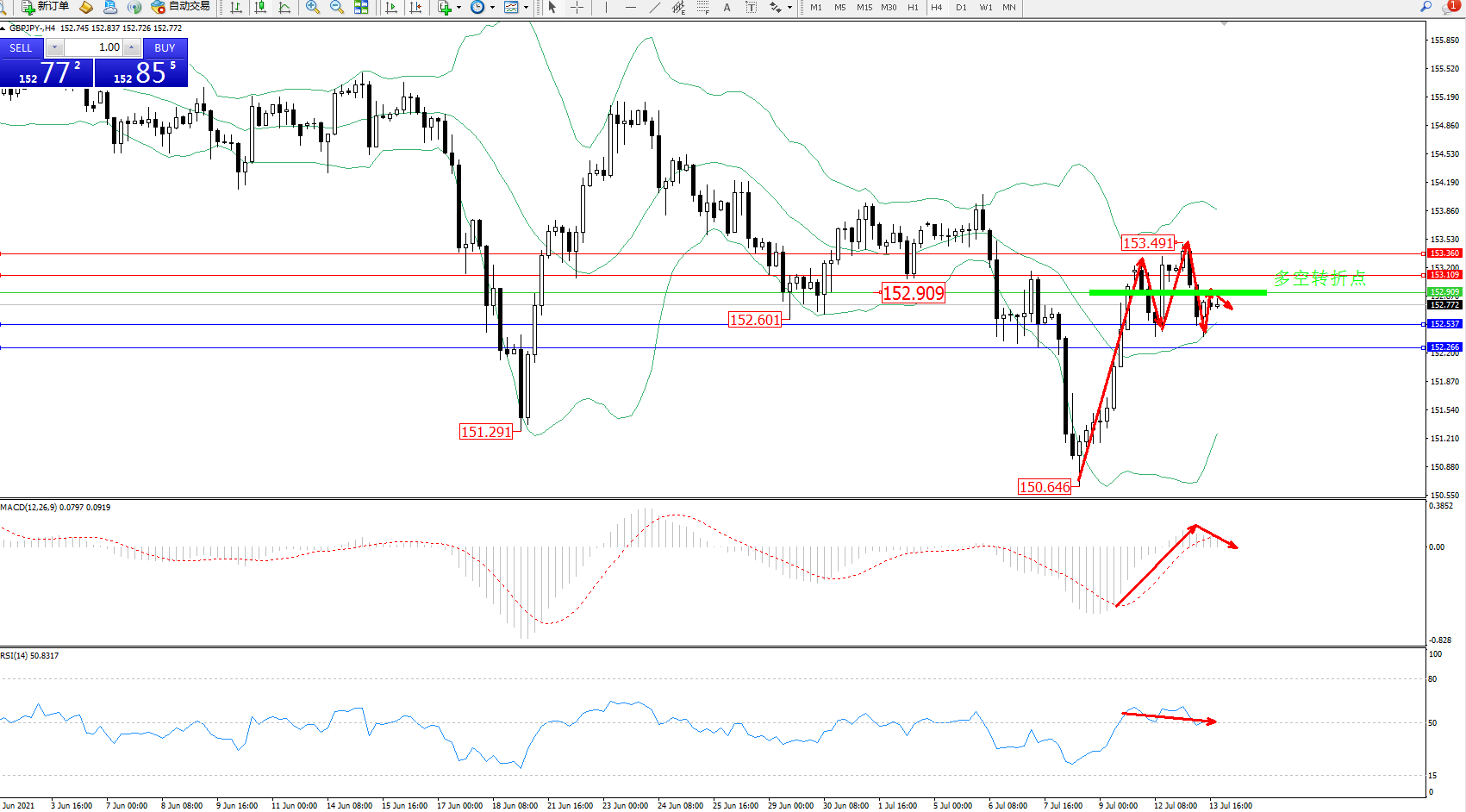 技术点评:低位多头动力强势回升至153.491附近遇阻回撤,触及布林带指标中轨附近节点后得到支撑震荡上移,布林带指标呈收口走势持续震荡,MACD指标处于0轴线附近弱势徘徊中,RSI指标处于50均衡线附近持续整理中;
