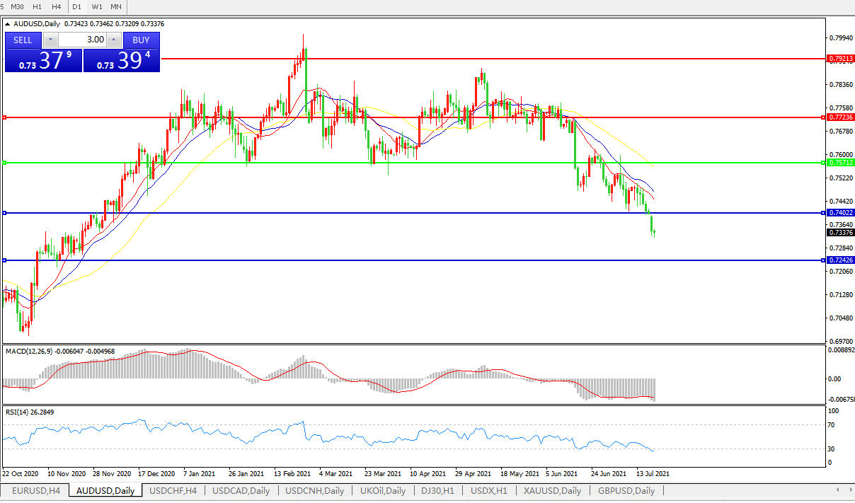 技术面简析:日图均线发散下行,汇价持续弱势,MACD运行于0轴下方且量能小幅放量,RSI持续走弱,预计汇价大概率将进一步走低。