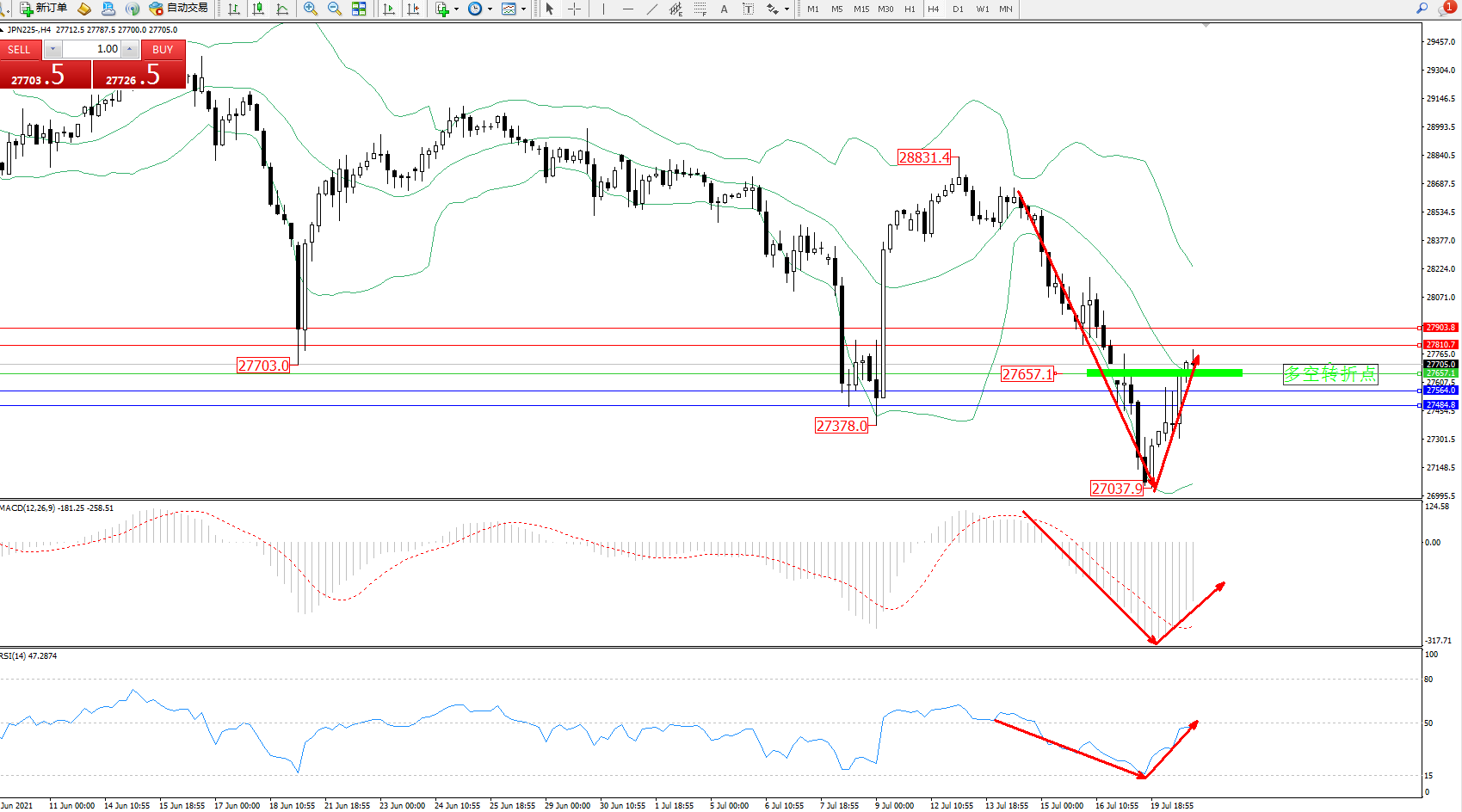 技术点评:空头动力延续布林带指标下轨附近节点持续震荡下行,低位抵达27037位置后得到短期支撑呈V型反转上扬,突破中轨附近节点后开始震荡中,布林带指标呈下行趋势走势后开始收口向上回升中,MACD指标处于空头区域低位开始缓慢向上移动中,RSI指标处于空头区域低位持续震荡上移,即将触及50均衡线附近节点;
