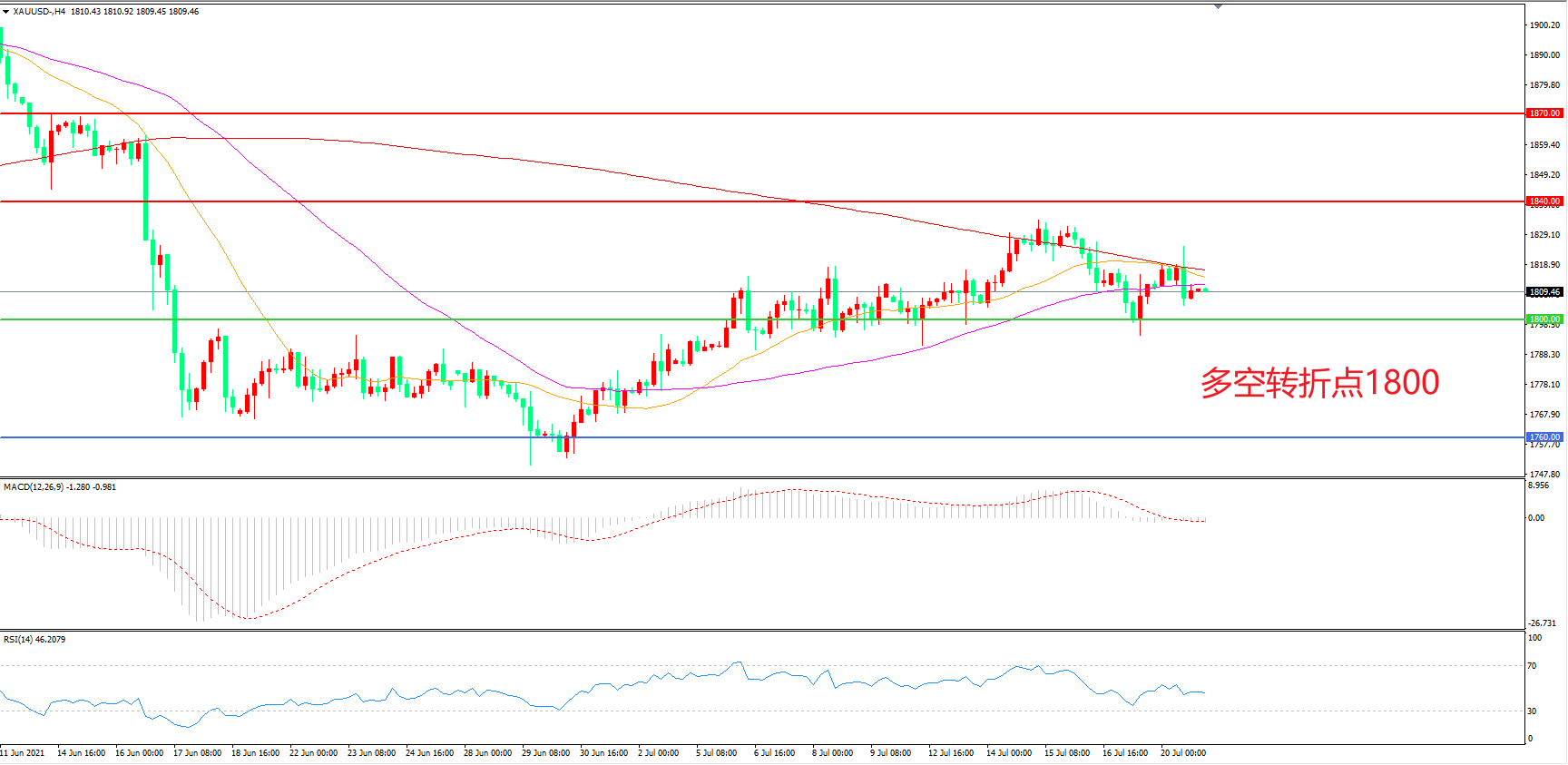 交易策略:  在1800.00之上看涨,目标1840.00        1870.00