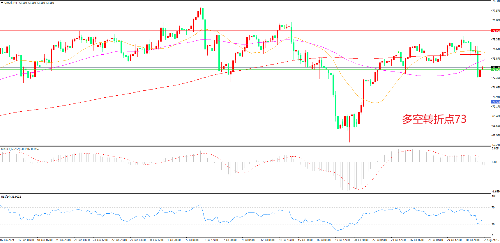 4小时图看,油价长阴下破,前期涨势被吞噬殆尽,短线行情陷入低迷,73美元成为下方支撑,均线系统成为上方阻力,MACD红柱缩短,RSI指标走平,日内油价延续震荡概率较大。