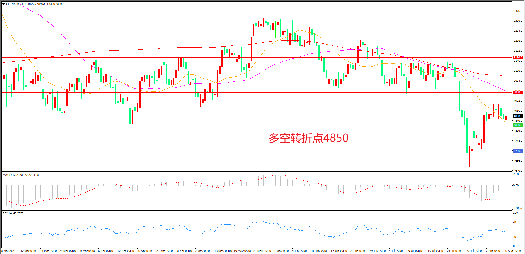 4小时图看,沪深300以4850为依托窄幅震荡,短线行情有所回暖,5000点成为上方阻力,MACD绿柱减少,RSI指标走平,日内震荡上行概率较大。