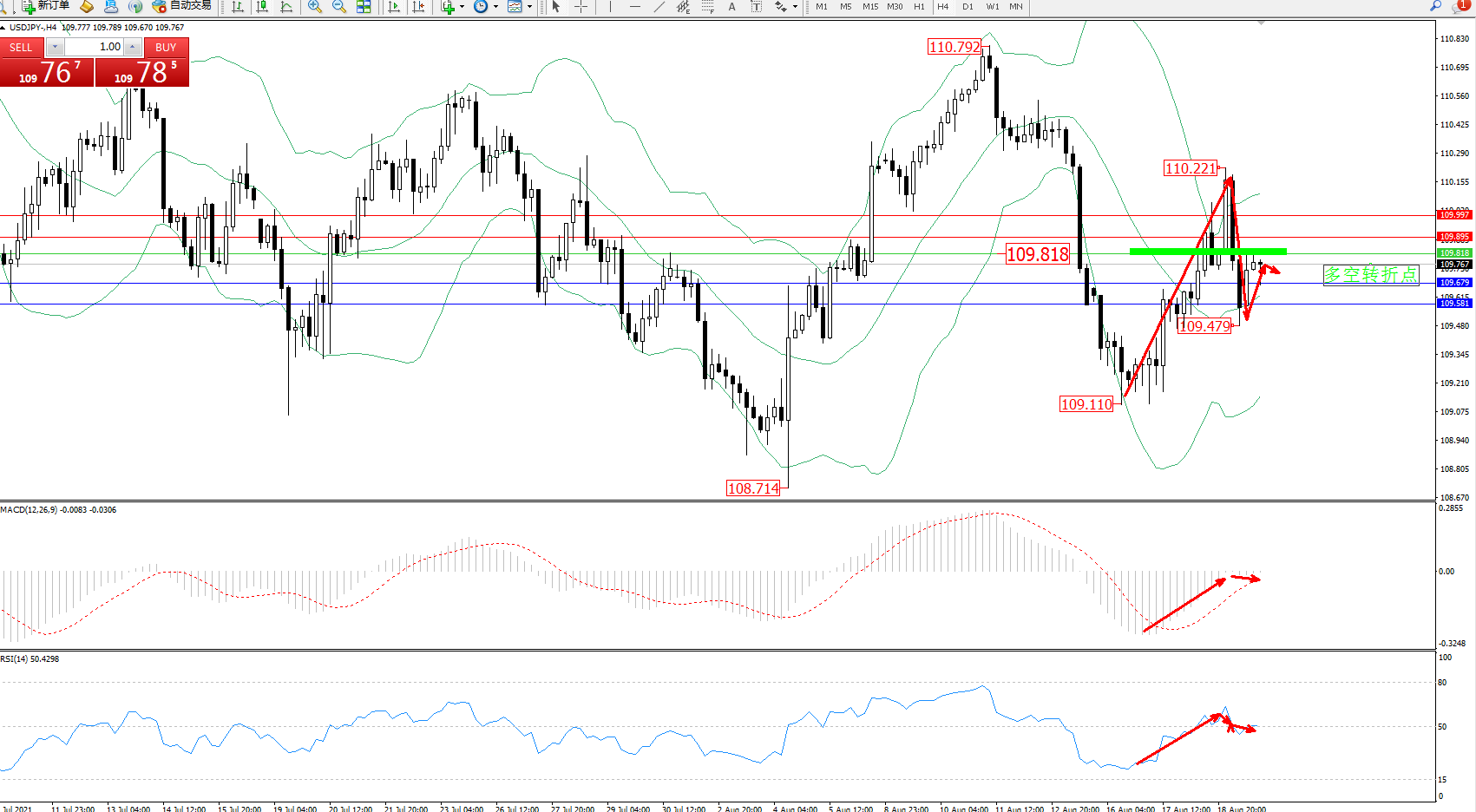 技术点评:多头动力快速拉升后突破布林带指标上轨抵达110.221位置遇阻回撤,纠结于中上轨区间持续震荡向上移动,但多头动力仍有欠缺,布林带指标呈收口走势后有向上移动迹象,MACD指标低位多头动力持续震荡上移至0轴线下方弱势徘徊中,RSI指标纠结于50均衡线附近持续整理中;