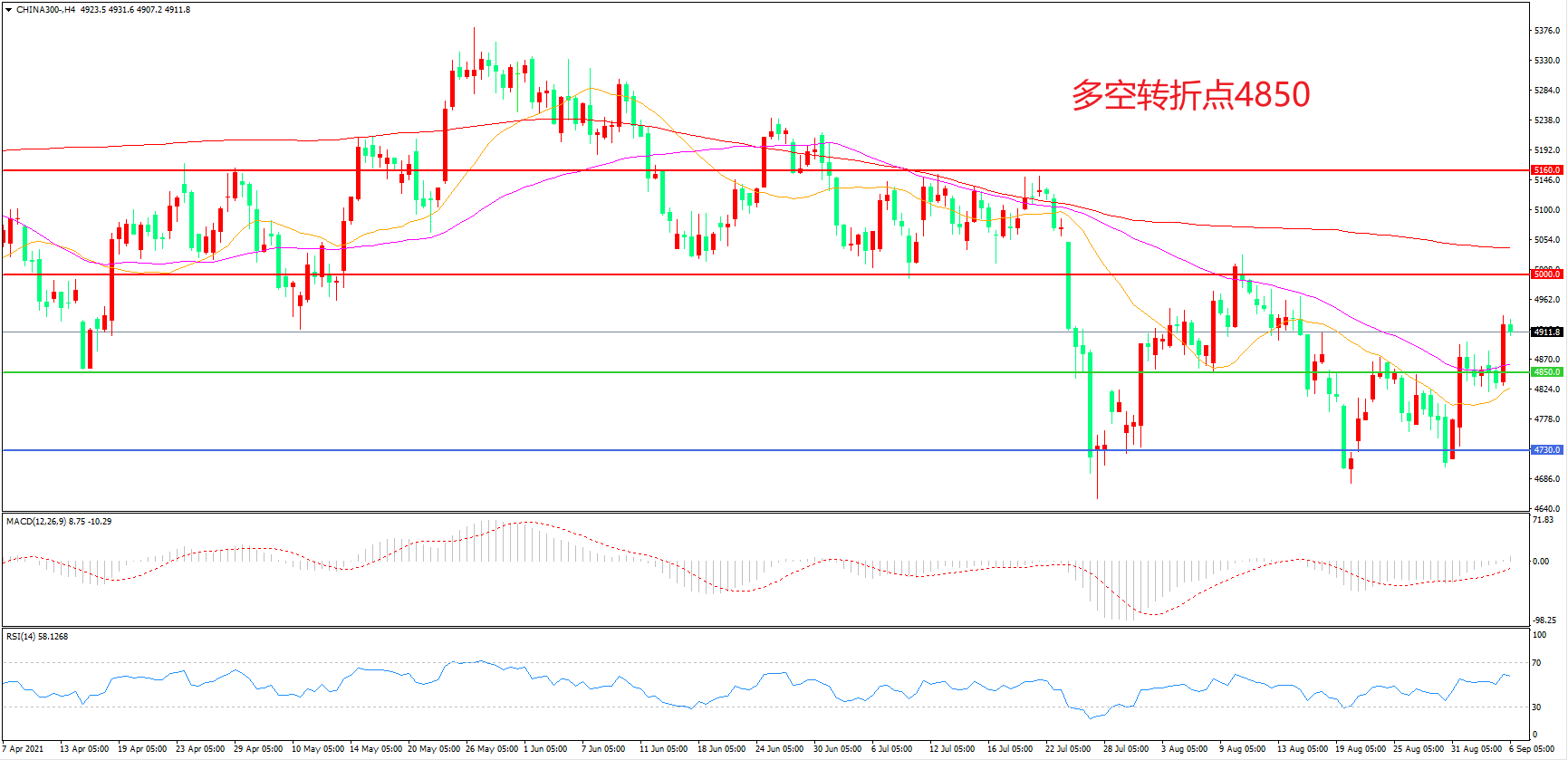 4小时图看,沪深300长阳拉升,整体走势偏强,21周期均线成为支撑,4850成为多空分水岭,MACD红柱增加,RSI指标走平,日内震荡上行概率较大。