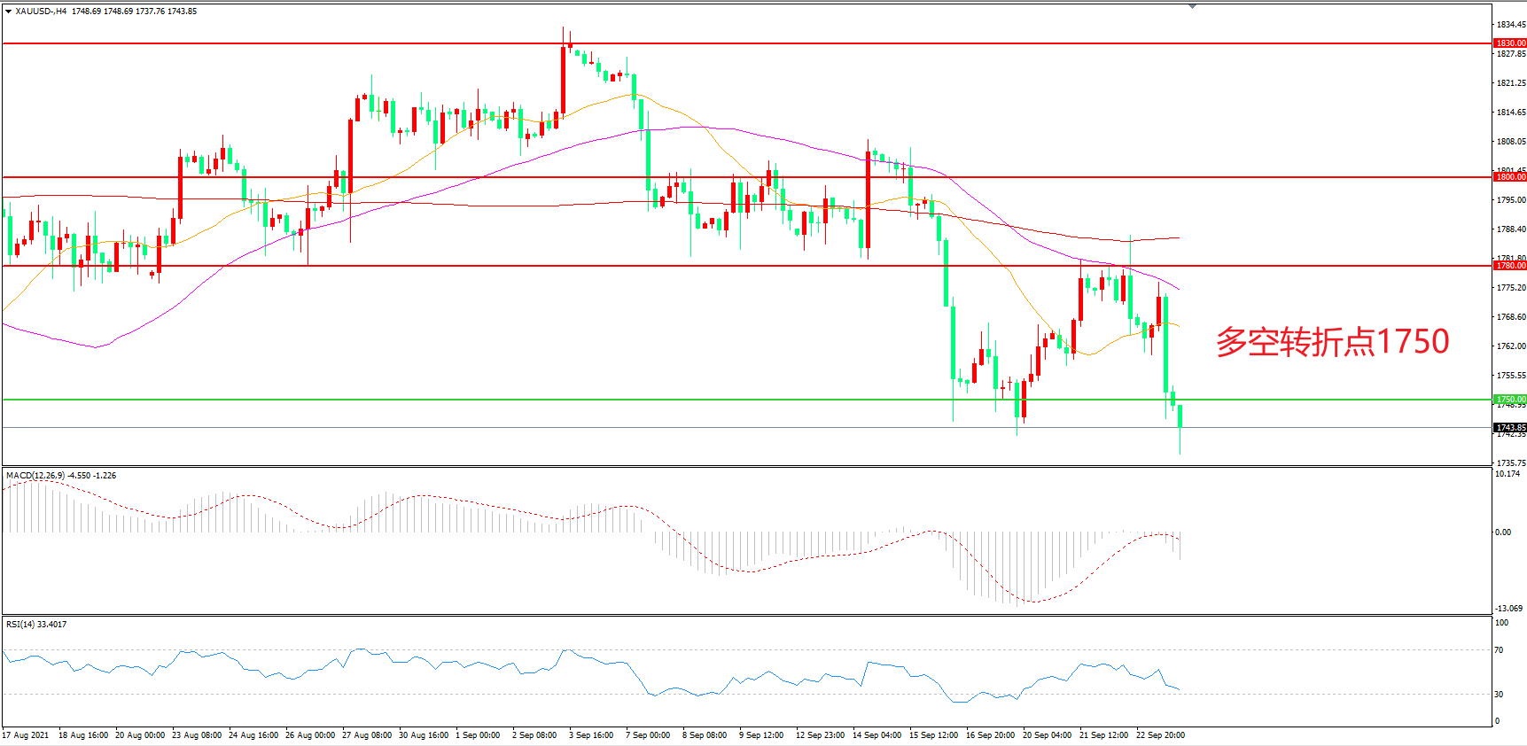 4小时图看,金价受阻于55周期均线后长阴下破,短期走势偏空,1750成为短期多空分水岭,MACD绿柱增加,RSI指标走平,日内震荡下行概率较大。