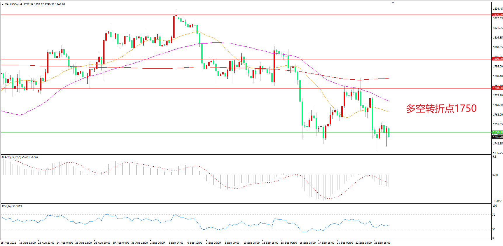 4小时图看,金价长阴下破后延续低位震荡,短期走势偏空,1750成为短期多空分水岭,均线系统成为上方阻力,MACD绿柱增加,RSI指标走平,日内震荡下行概率较大。