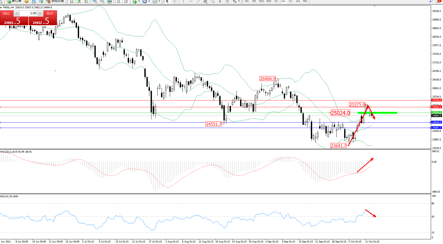 技术点评:低位多头动力持续震荡上扬,高位突破布林带指标上轨至25375位置后遇阻,开始震荡回撤,纠结于中上轨区间短暂下行,布林带指标呈张口走势后开始有收口迹象,MACD指标处于多头区域维持震荡,RSI指标处于50均衡线上方多头区域维持整理回撤中;