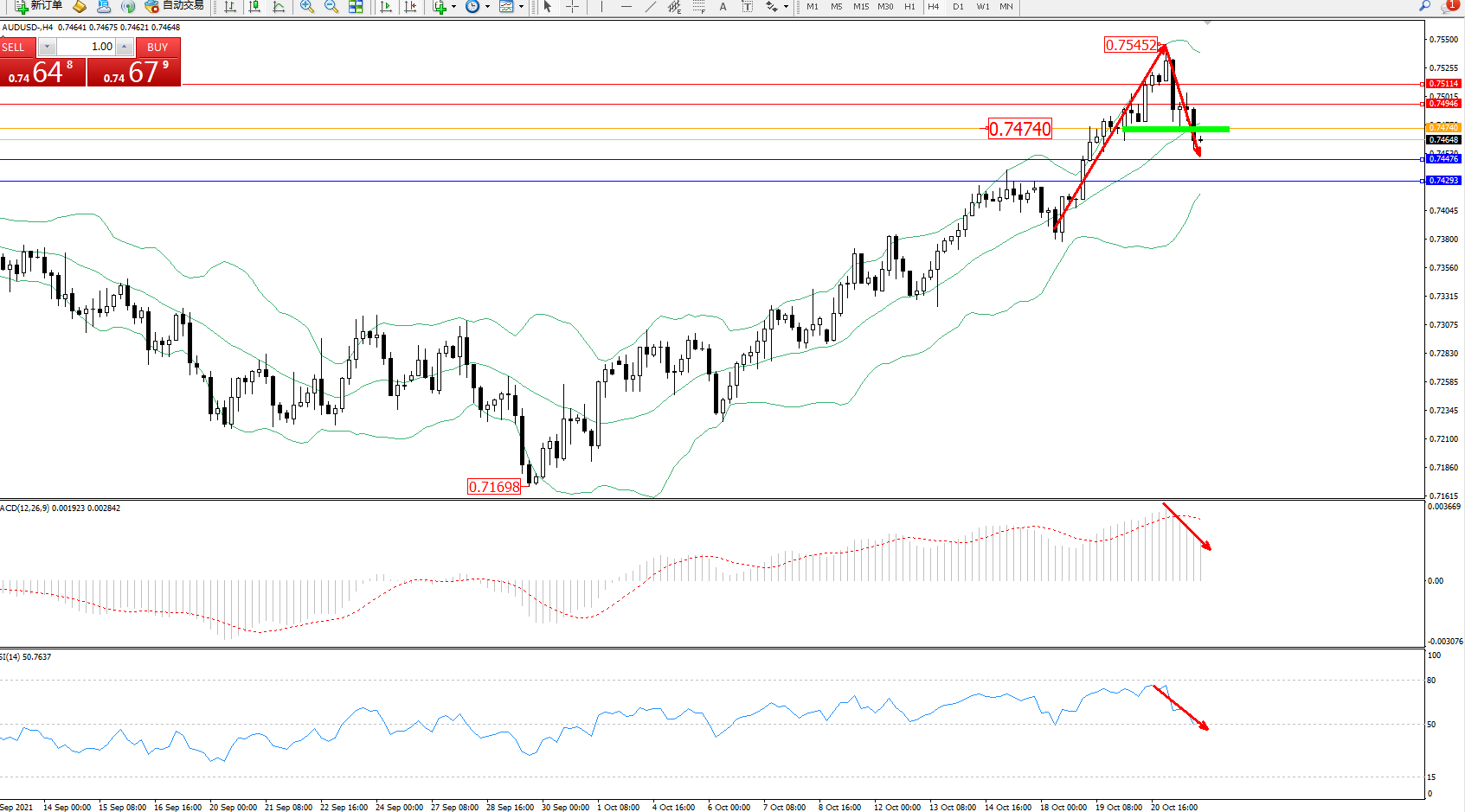 交易策略:0.74740下方看跌,目标0.74476、0.74293