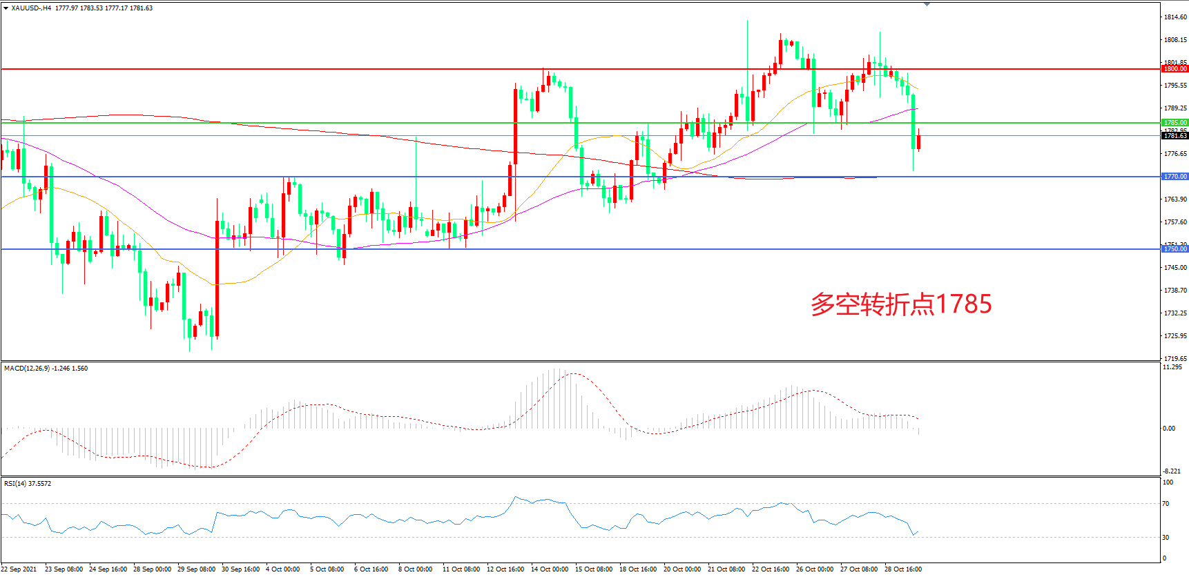 上周五(10月29日),市场对美联储利率决议缩债和明年升息的预期不断升温给金价带来沉重的压力,现货黄金破位大跌,收报1781.63美元/盎司。可以说,目前全球商品走势都会围绕着本周的利率决议给出的基调来运行,目前美联储内部对于何时加息的问题上,鹰鸽两派的分歧依然较大,金价本周可能会出现巨幅波动。