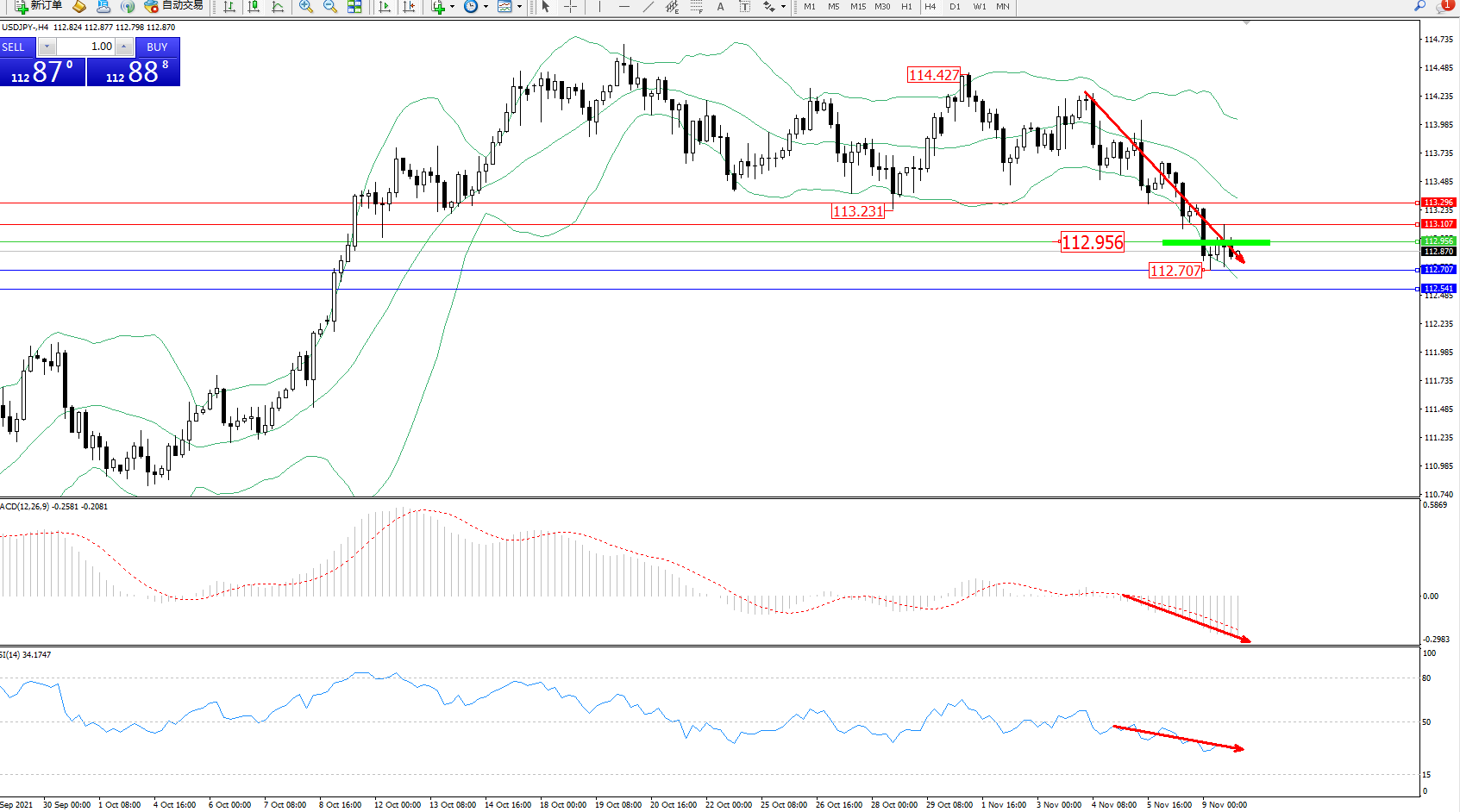 技术点评:空头动力延续布林带指标通道中下轨区间持续震荡下行,低位抵达112.7070位置后得到短暂支撑开始整理,短期空头动力依旧有继续下行态势,布林带指标呈下行趋势走势良好,且处于张口走势中,MACD指标处于空头区域维持整理缓慢下移,RSI指标处于空头区域维持整理平移中;