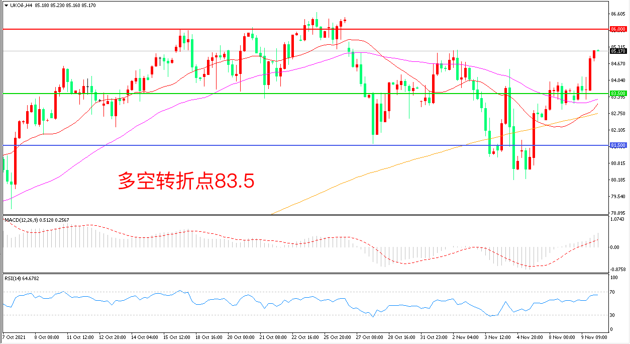 周三(11月10日)凌晨,美国白宫表示,今天不会宣布释放战略石油储备(SPR)的计划,将继续与OPCE合作提高石油供应,布伦特原油开盘大涨,大幅上行后报85.17美元/桶。同时根据美国石油协会公布数据,API原油库存意外减少248.5万桶,如果晚间EIA库存出现大幅下降,油价将再次迎来飙升。