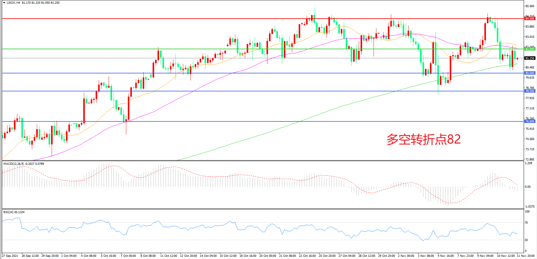 4小时图看,油价破位大跌后于200周期均线附近企稳,短期跌势暂缓,55周期均线成为阻力,82成为多空分水岭,MACD绿柱增加,RSI指标走平,日内延续震荡概率较大。