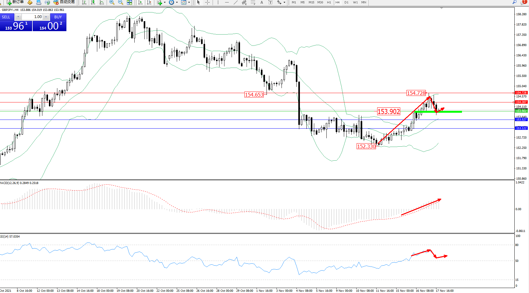 技术点评:多头动力延续布林带指标上轨附近节点持续震荡上扬,高位抵达154.728位置后短期遇阻回撤,纠结于布林带指标中上轨区间持续震荡中,低位拉升上扬走势依旧有上移潜力,布林带指标呈张口走势后开始收口上移,MACD指标处于多头区域维持整理平移,RSI指标处于多头区域维持整理后开始缓慢回撤;
