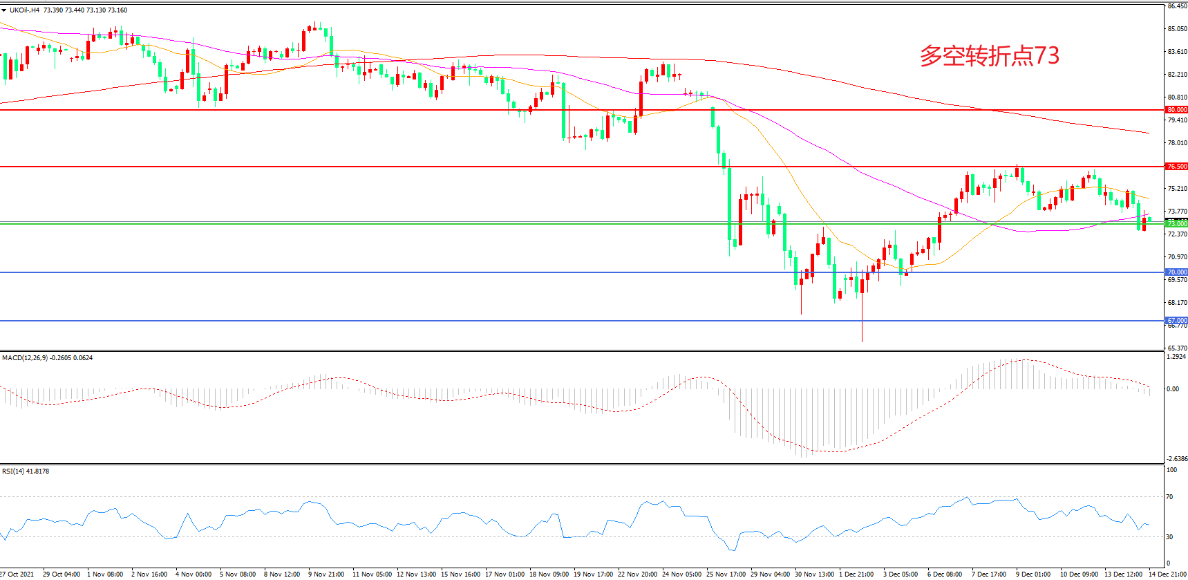 4小时图看,油价延续高位调整,区间震荡继续明显,73美元成为多空分水岭, MACD绿柱增加,RSI指标走平,日内延续震荡概率较大。