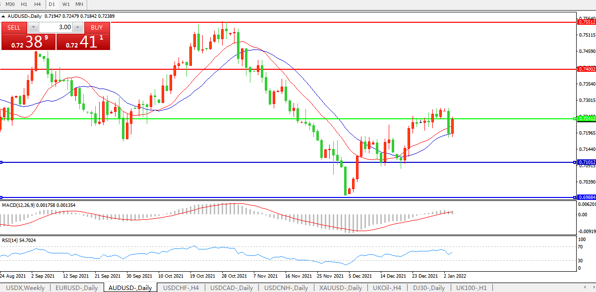 备选策略:0.7240上方看涨,目标0.7400、0.7550