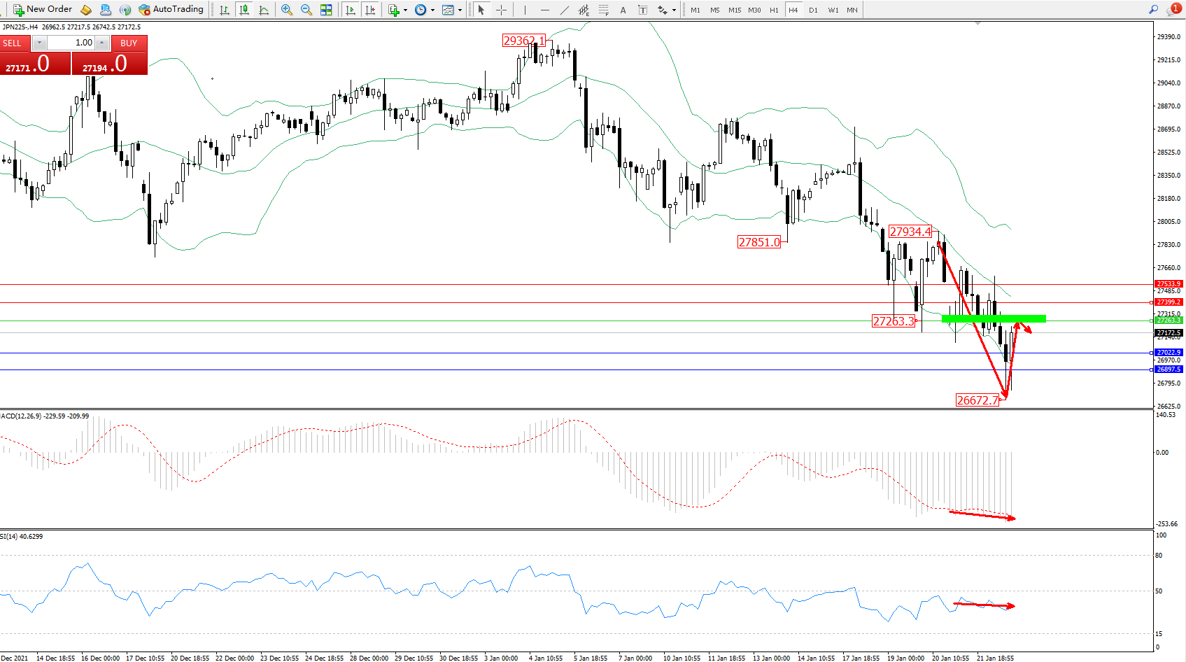 技术点评:空头动力延续布林带指标通道中下轨区间持续震荡下行,低位抵达26672位置届点后快速回升,但下行趋势态势良好,布林带指标呈向下移动趋势依旧,MACD指标处于空头区域维持低位整理平移,RSI指标处于空头区域维持窄幅弱势徘徊中;