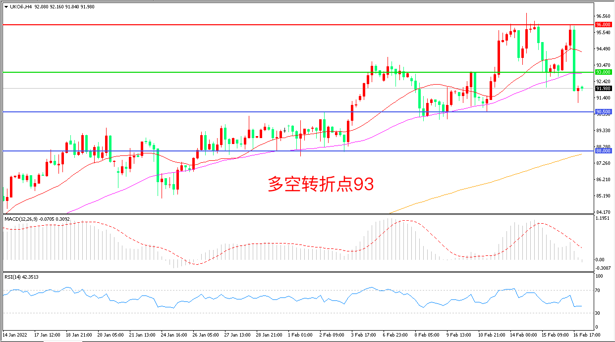 4小时图看,油价自高位连续下破,上行趋势遭到破坏,93美元成为多空分水岭,均线系统走平,MACD红柱缩短,RSI指标走平,日内震荡下行概率较大。