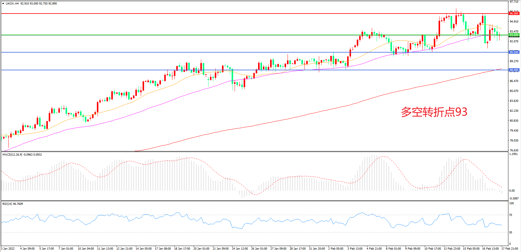 4小时图看,油价延续高位震荡,横盘迹象较为明显,93美元成为多空分水岭,均线系统走平,MACD绿柱增加,RSI指标走平,日内震荡下行概率较大。