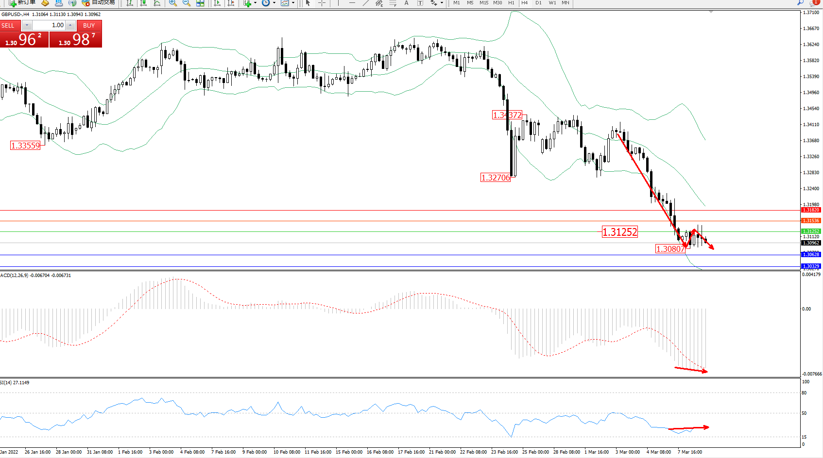 技术点评:空头动力延续布林带指标下轨附近强势下挫,低位抵达1.30807位置节点后开始低位窄幅整理,短期空头动力有继续下行态势,布林带指标呈收口不断向下移动态势良好,MACD指标处于空头区域维持低位整理中,RSI指标处于空头区域维持窄幅徘徊中;