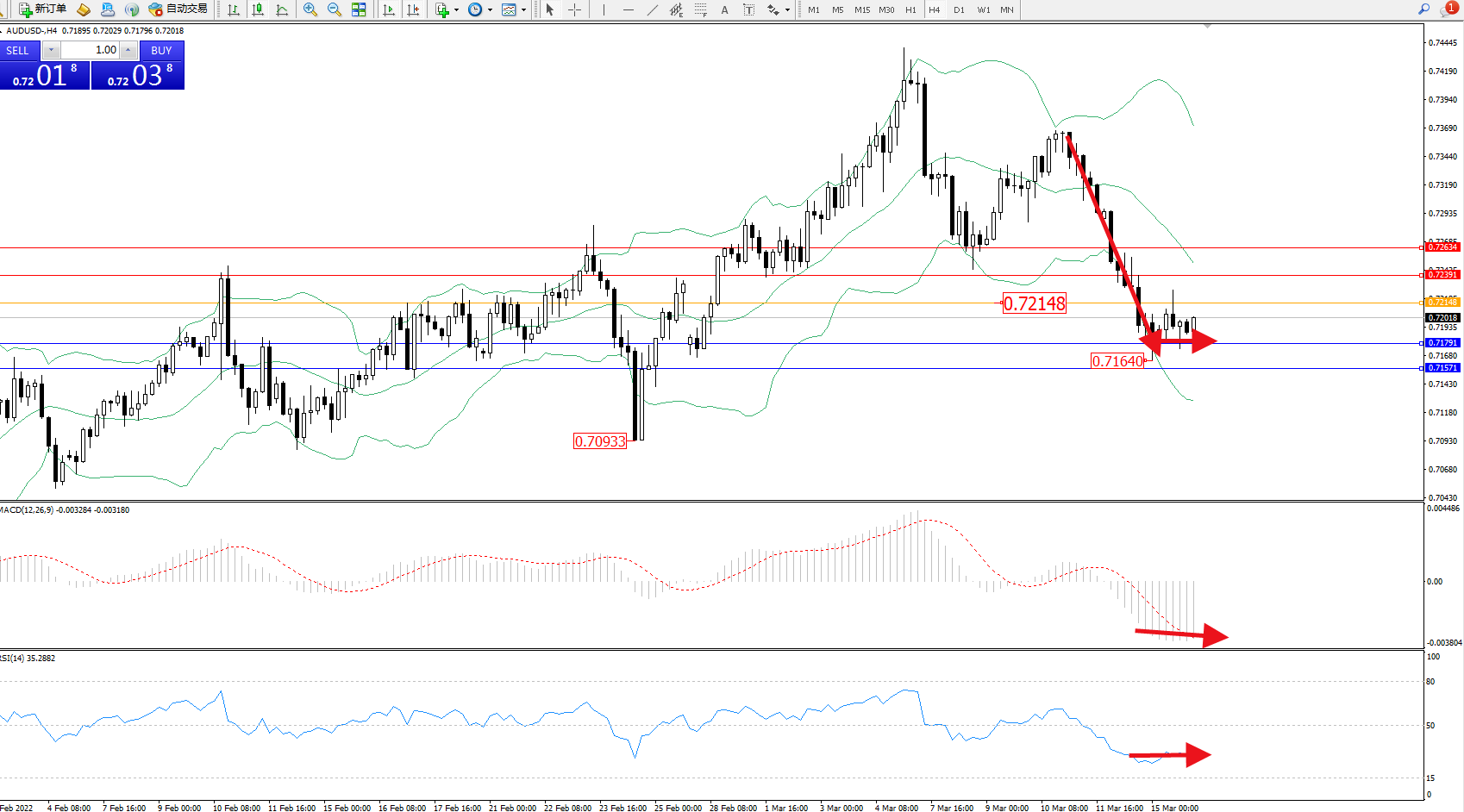 技术点评:空头动力延续布林带指标下轨附近持续震荡下行, 低位抵达0.71640附近节点后开始整理,短期或维持窄幅震荡,短期空头下行动力有所减弱,但市场下行移动趋势或将延续,布林带指标呈张口走势后开始有缓慢收口迹象,MACD指标处于空头区域维持整理平移,RSI指标处于空头区域低位维持缓慢徘徊中;