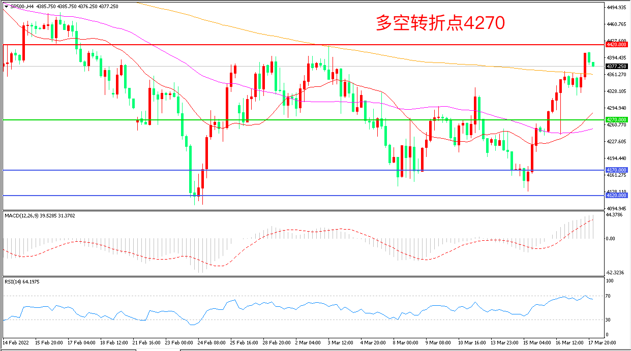 周四(3月17日),俄罗斯总统新闻秘书称,俄乌代表团谈判工作仍在继续,目前尚未签署协议,原油高涨带动的能源板块领涨,标普500延续强势形态,收报4381.05点。在美联储决议未做出更激进鹰派行动后,投资者正在消化美联储货币政策前景,从历史上看来,在美联储加息后的头30天内,标普500指数可能会下跌,随后几个月转为上涨。
