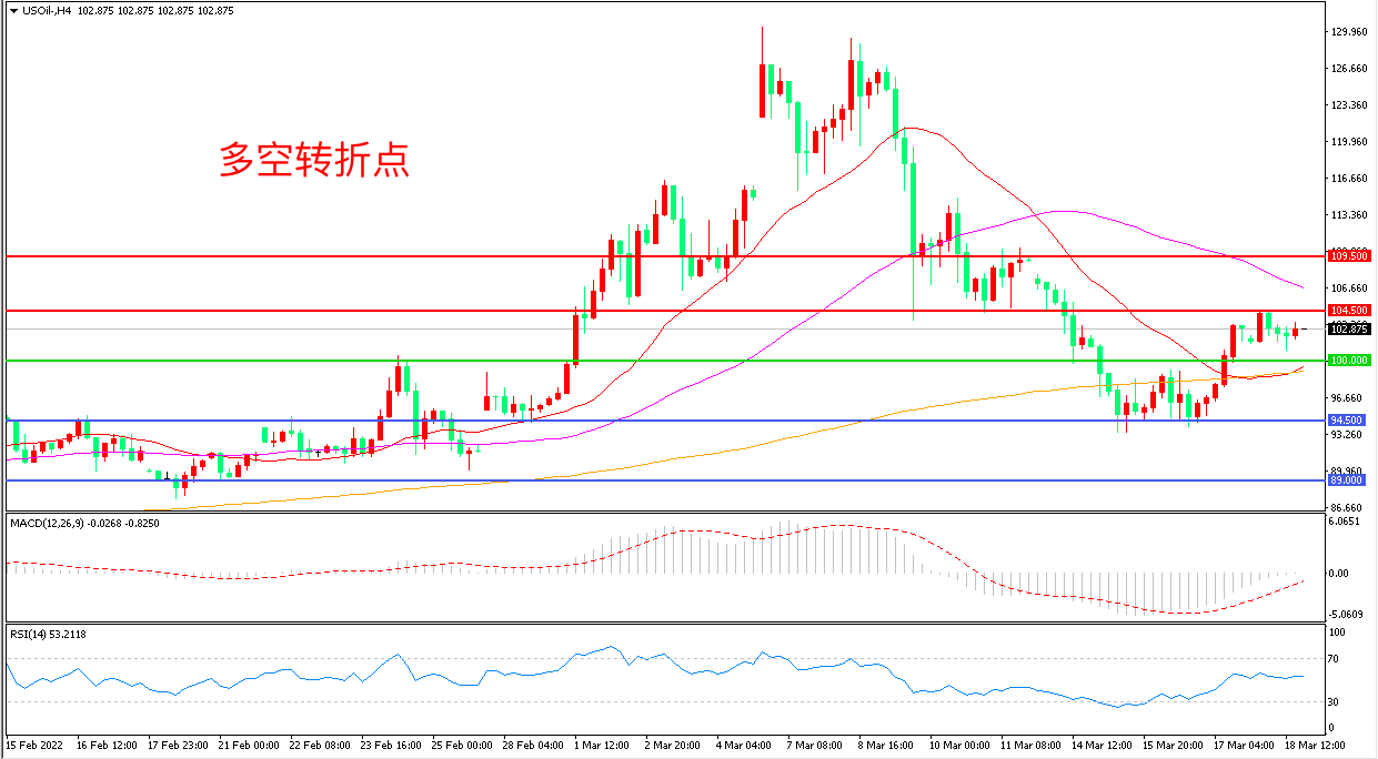 上周五(3月18日),国际能源署警告俄罗斯4月的供油将减少约四分之一,市场越发预期冲突将造成俄罗斯原油供应严重缺失,美国WTI原油延续强势走势,收报102.87美元/桶。中期来看,供应偏紧以及高通胀暂时很难控制下来的背景下,油价还是有其高位运行的内核逻辑,短期油价延续强势概率较大。