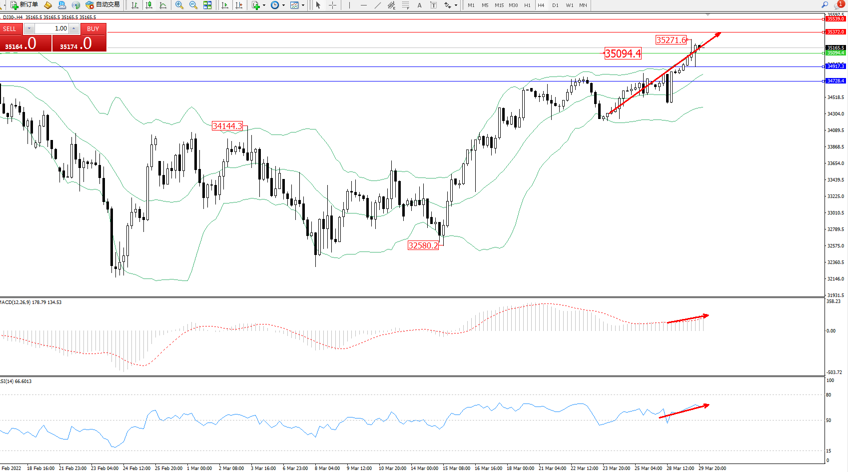 技术点评:多头动力延续布林带指标通道中上轨区间持续震荡上扬,高位抵达35271位置节点后开始整理,短期多头上扬走势或将持续,布林带指标呈缓慢张口不断上移中,MACD指标处于多头区域维持整理上移,RSI指标处于多头区域维持上扬中;
