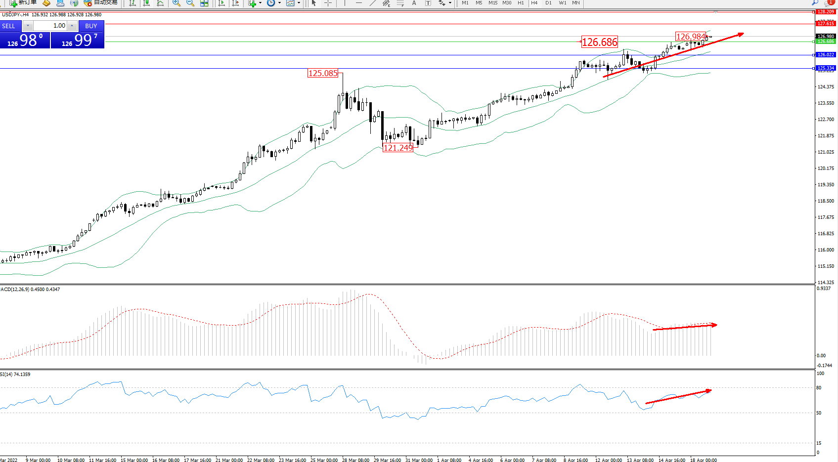 技术点评:多头动力延续布林带指标通道中上轨区间持续震荡上扬,高位抵达126.984附近节点开始整理,短期多头动力有继续向上移动态势,布林带指标呈上行趋势走势不断上移后开始缓慢张口,MACD指标处于多头区域维持整理平移,RSI指标处于多头区域维持震荡缓慢向上移动中;