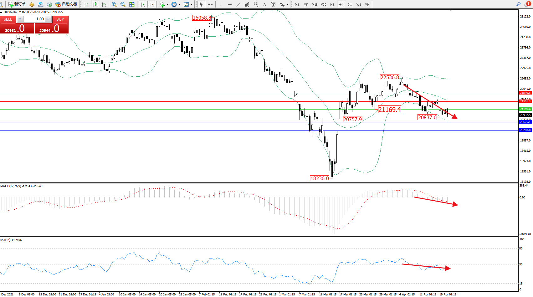 香港恒生指数4月20日(周三)收盘下跌83.09点,跌幅0.4%,报20944.67点;港股主要指数冲高回落收跌,恒生科技指数跌0.54%。盘面上,大型科技股普遍下跌,网易跌超2%,阿里巴巴、美团、百度、腾讯均有跌幅;香港特区政府环境局19日向立法会提交文件,指立法会早前已通过相关草案,有至少18个月的准备期,目标在2023年下半年实施垃圾征费,会根据计划配套的进度和社会情况,就具体实施日期征询立法会意见。初步建议在实施后一段时间内,向全港合计约290万个住户,免费派发指定的垃圾袋。