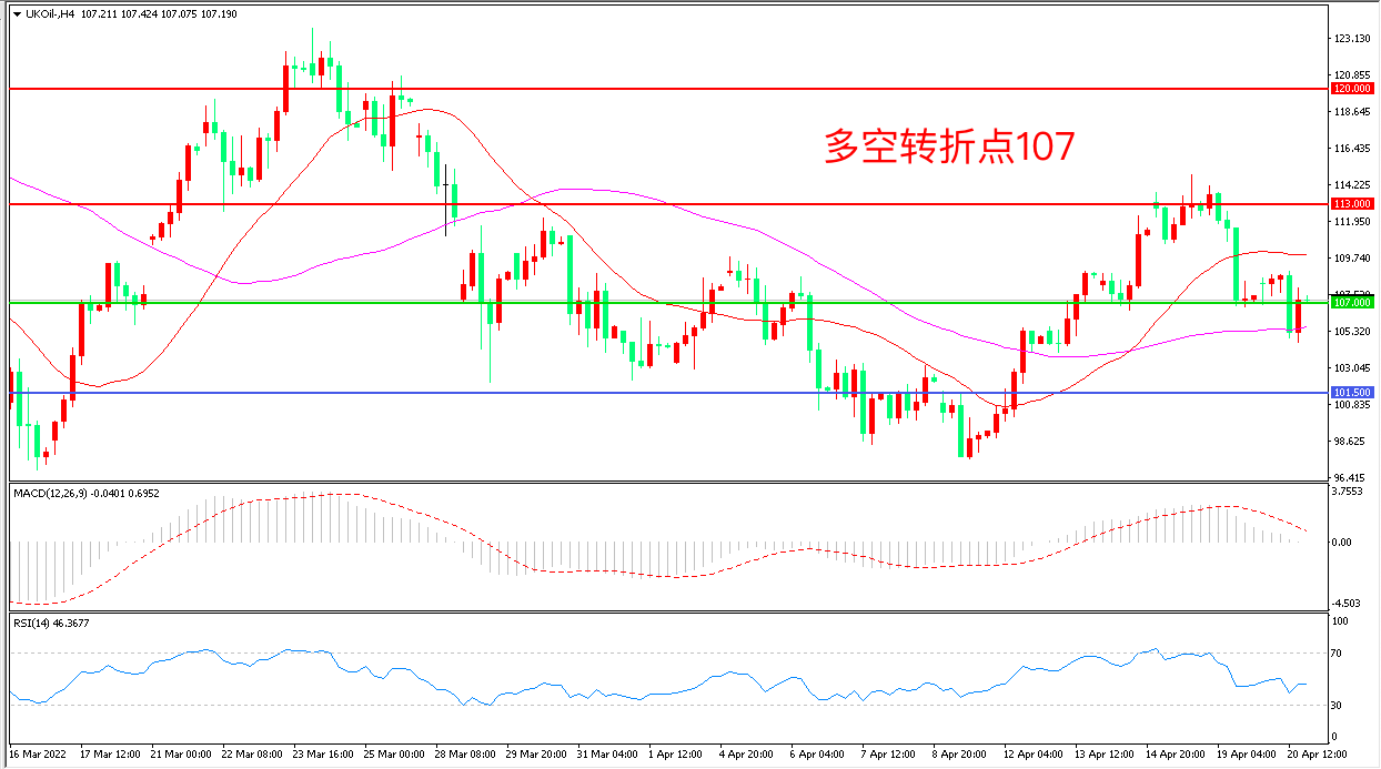周三(4月20日),油价全球经济增速被下调和需求疲软的“拉锯战”之间波动不安,,布伦特原油宽幅震荡后,收报107.07/桶。据称,欧盟将在本周末的法国大选后,宣布对俄罗斯石油实行全面禁运,如果制裁再进一步,有可能导致油价再度飙升,另外本周日法国大选结果也会对短期行情形成冲击,务必重点关注。