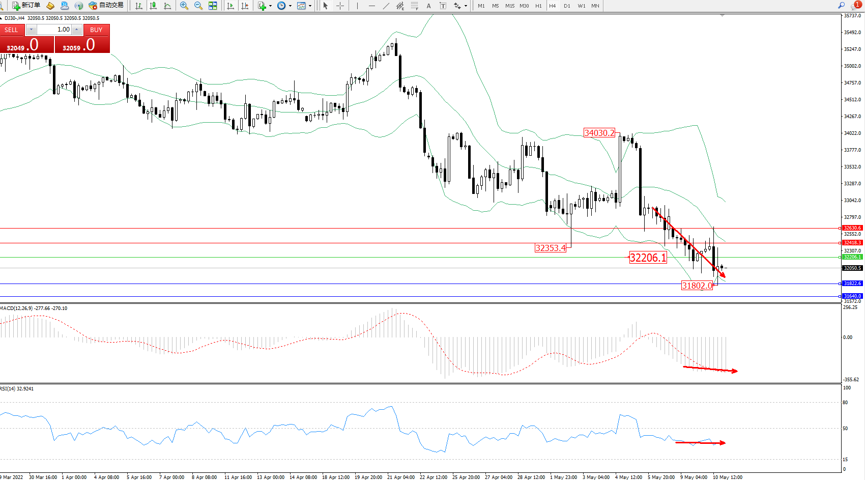 技术点评:空头动力延续布林带指标通道中下轨区间持续震荡下挫,低位抵达31802附近节点后震荡,短期空头下行动力未见有止步迹象,布林带指标呈收口走势不断下行,MACD指标处于空头区域底位维持弱势徘徊中,RSI指标处于50均衡线下侧窄幅整理。