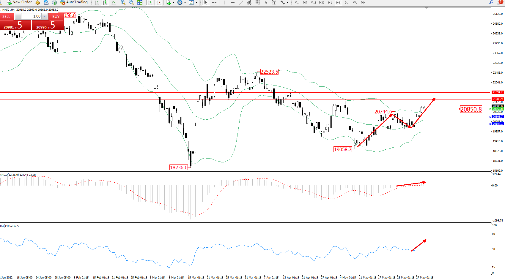 香港恒生指数5月30日(周一)收盘上涨426.57点,涨幅2.06%,报21123.93点;内地疫情持续缓和,上海稳步复工复产,多地促消费政策出台。加之上周五美股继续上涨。港股今日全天表现强势,恒指重回21000点上方,恒生科技指数涨3.94%创5月6日以来新高。今日南下资金净流入1.54亿港元,大市成交额放大至1288亿港元。