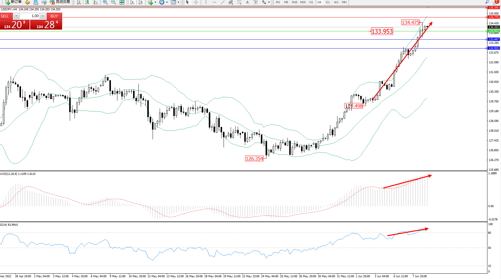 交易策略:133.953上方看涨,目标134.775、135.342