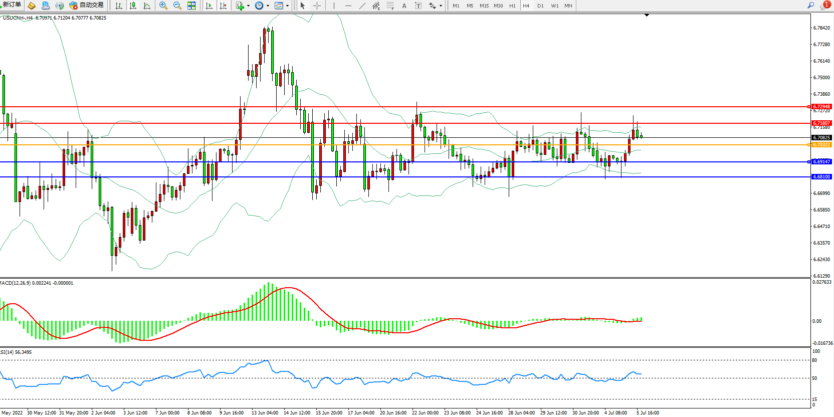 美元人民币USDCNH——4小时K线图显示: