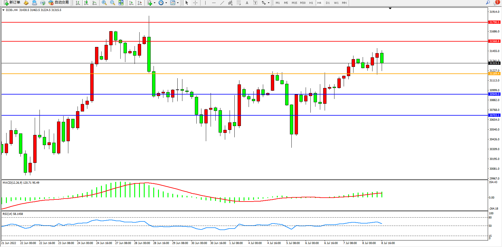 道琼斯指数7月8日(周五)收盘下跌45.35点,跌幅0.14%,报31339.20点;美国6月非农数据超预期,劳动力市场持续强劲,削弱了美国经济可能已经陷入衰退的说法,强化美联储加息预期。